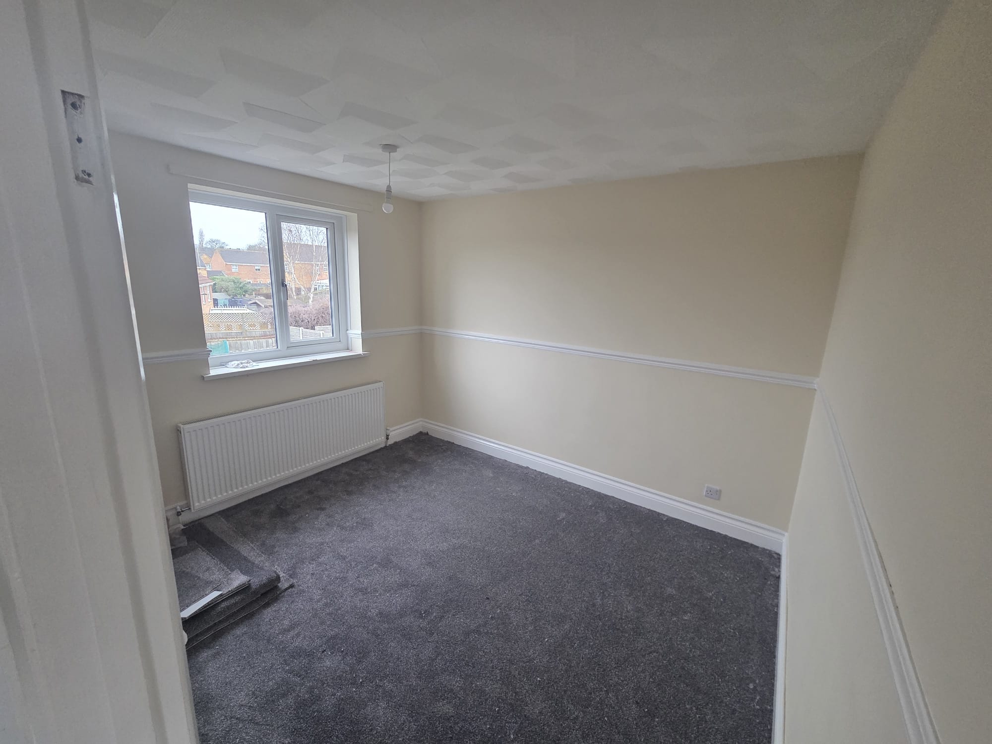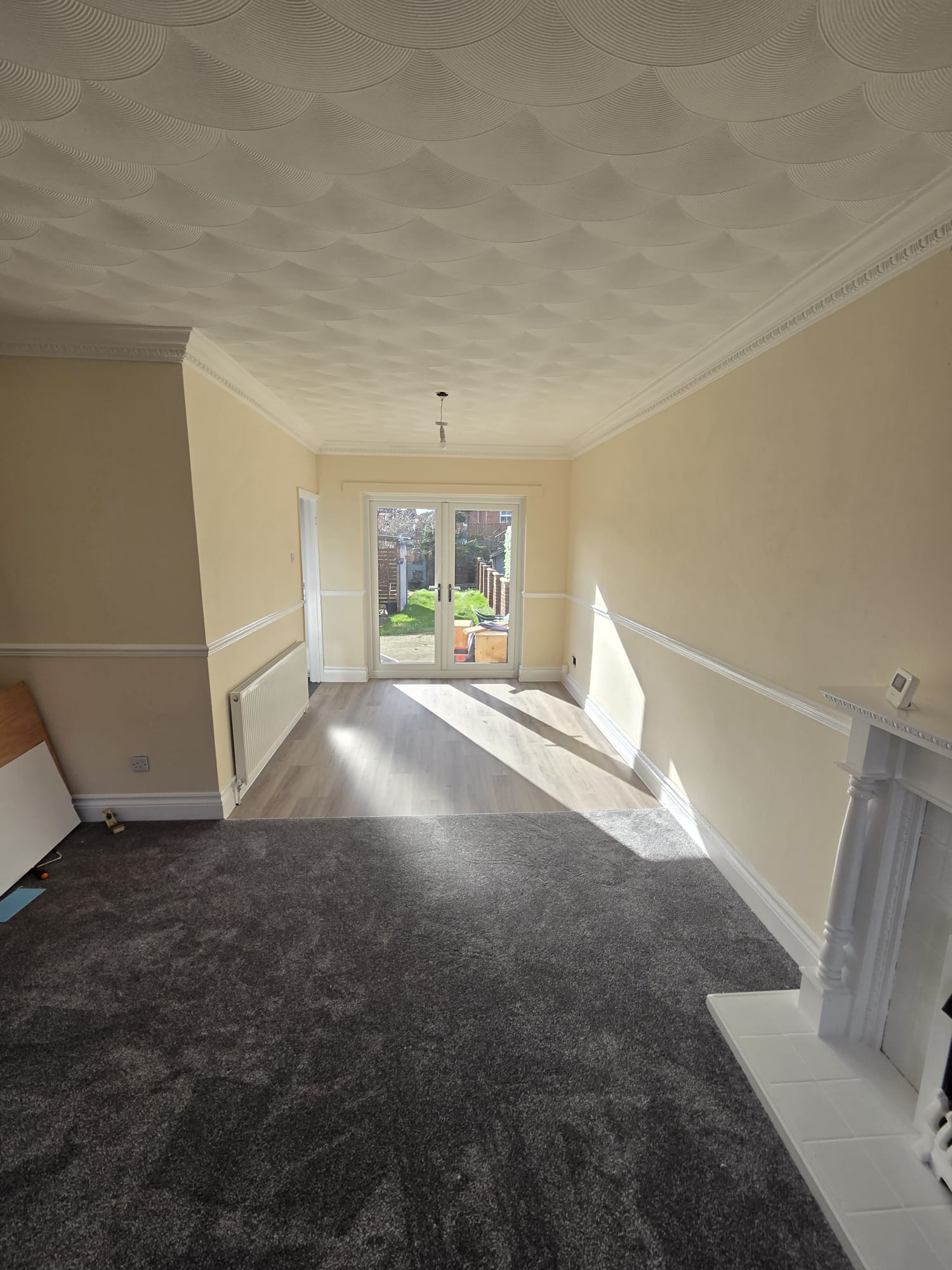 Massive through lounge with neutral cream plastered walls, white gloss and will be having half charcoal and half practical lvt in the dining area. Fireplace.