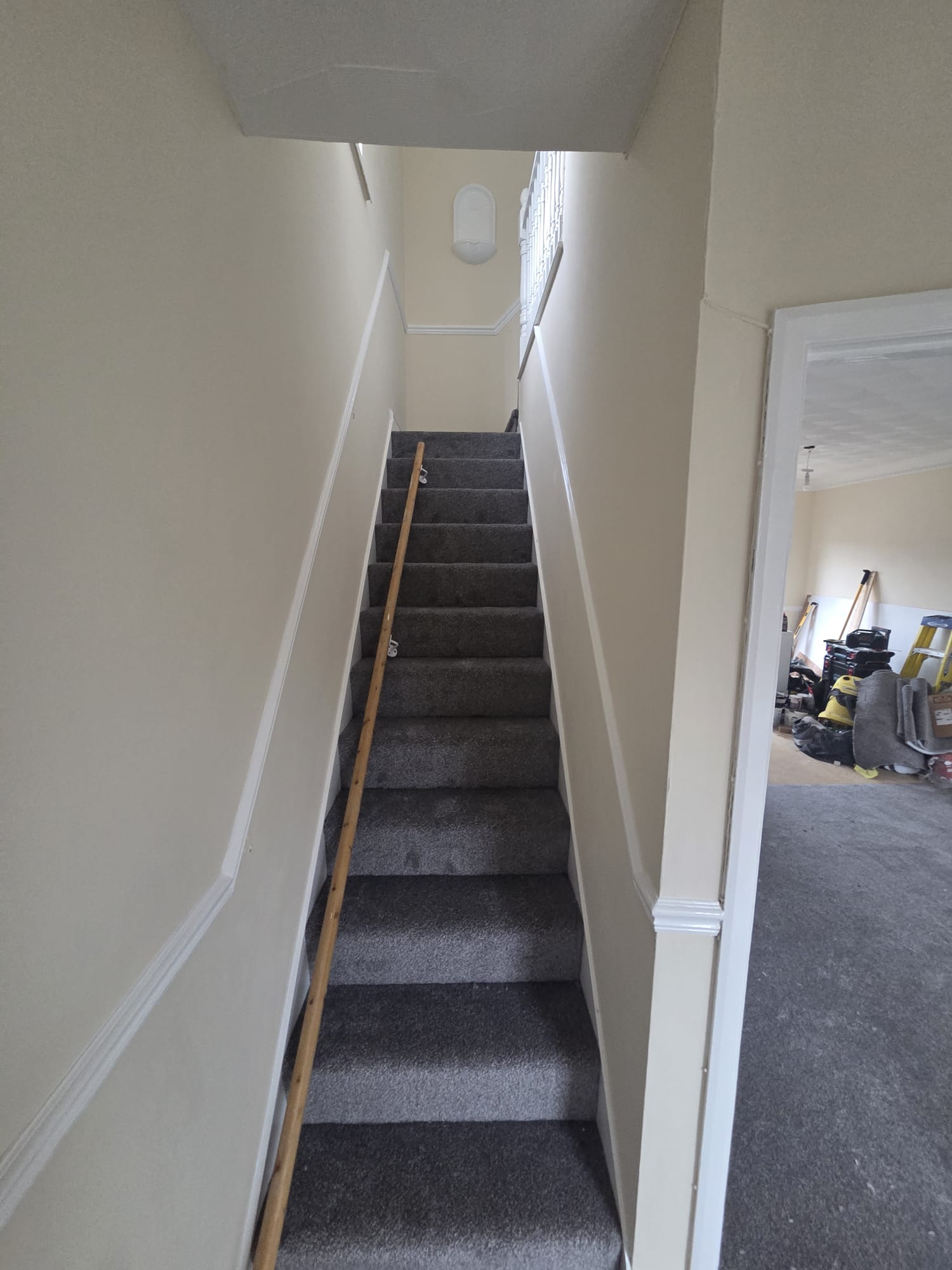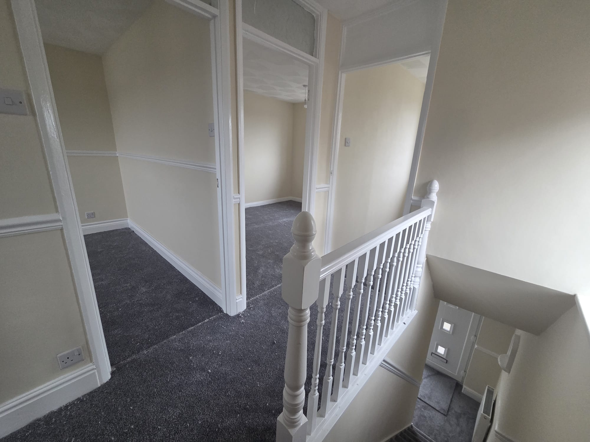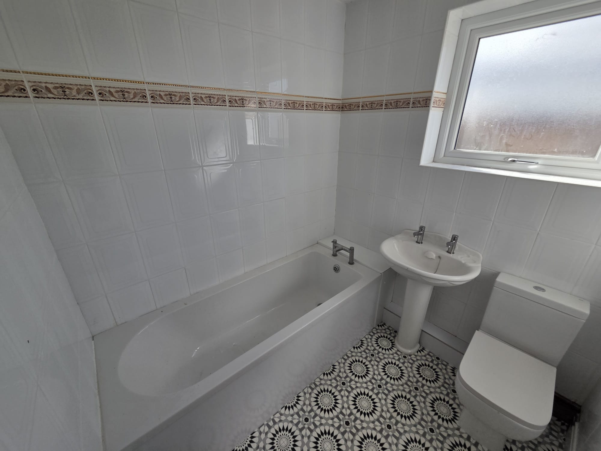 Front door entrance with access up a carpeted staircase leading into a good sized bathroom with new bath/panel, modern toilet and sink and fully tiled walls. New lino to be fitted.