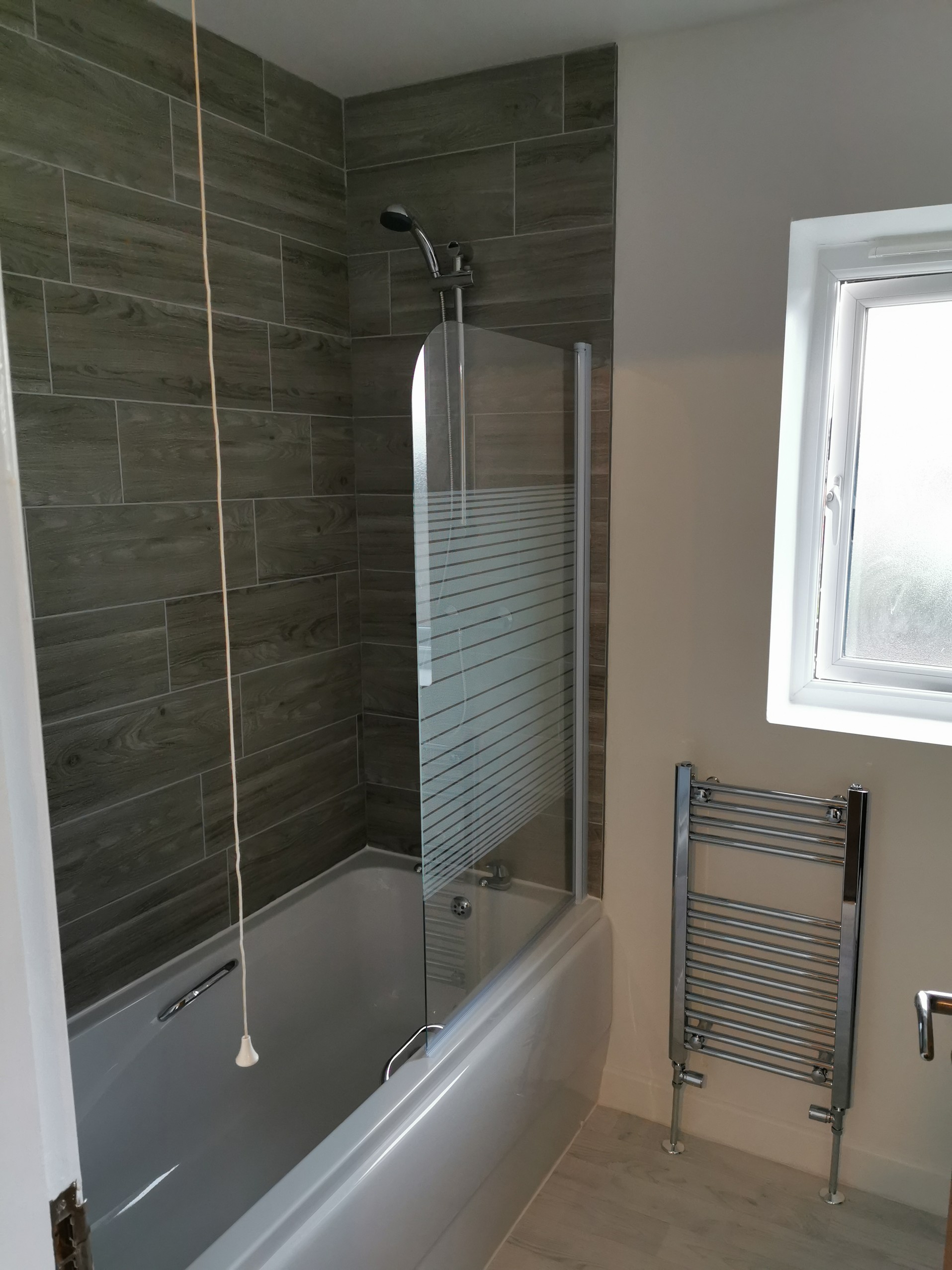 Ultra-modern bathroom with overbath brown modern washed wood effect tiles and neutral plastered walls. white 3 piece integrated bathroom suite and chrome over-bath power shower and chrome/glass shower screen. Chrome ladder radiator and white built in toilet with integrated chrome double-flush. White modern integrated sink with under-sink storage. Complementary and practical whitewashed wood effect flooring.