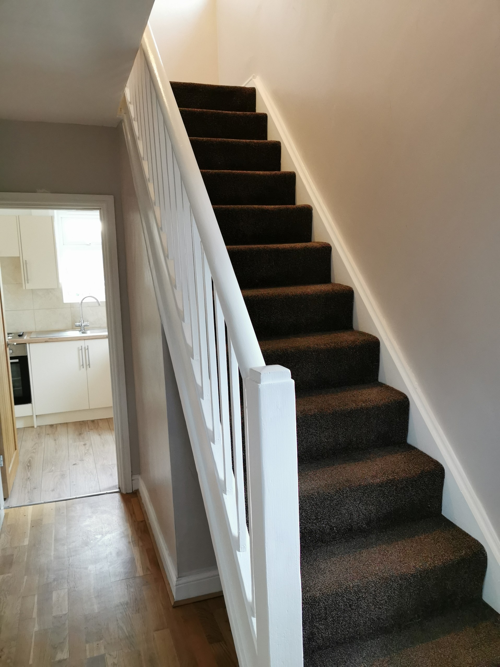 The carpeted staircase leads up to a large carpeted landing area with boiler cupboard additional storage and access also into:
