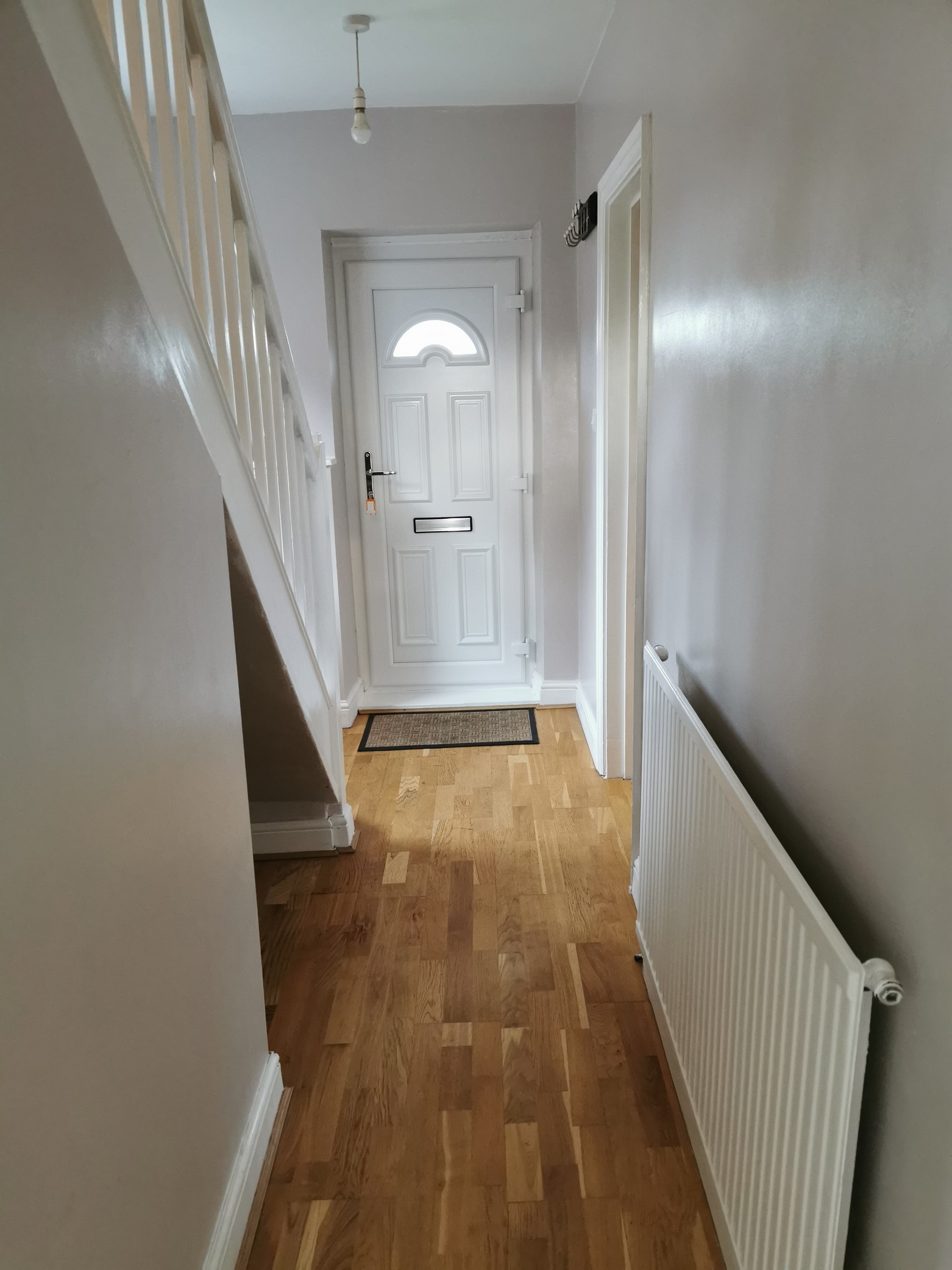Hallway with real wooden floor and neutral plastered walls. Under-stairs storage area.
