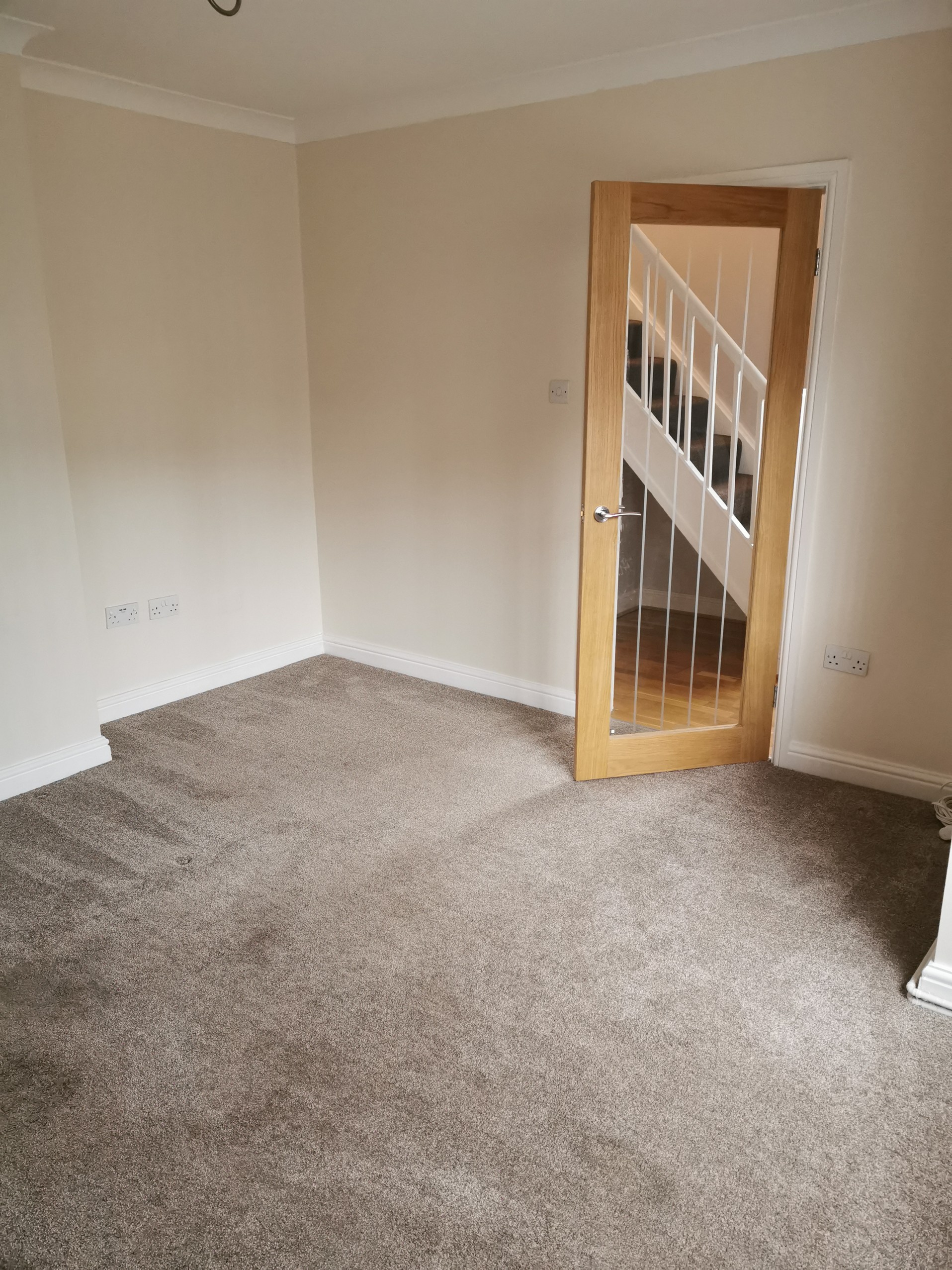 Linked to the kitchen there is a large crescent-shaped conservatory with UPVC windows and UPVC ceiling. Having a modern white and chrome ceiling fan and beige vertical blinds to all windows.Good sized lounge with mink carpet to floor and neutral plastered walls. Wood/glass modern door and chrome/glass light to ceiling. brown vertical blinds to the bay window area.