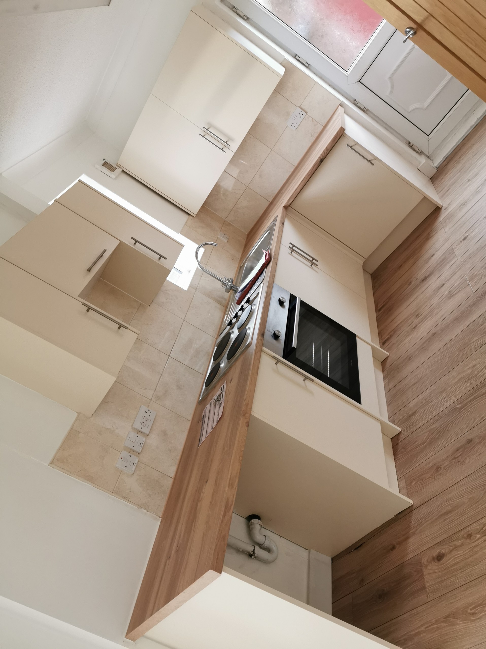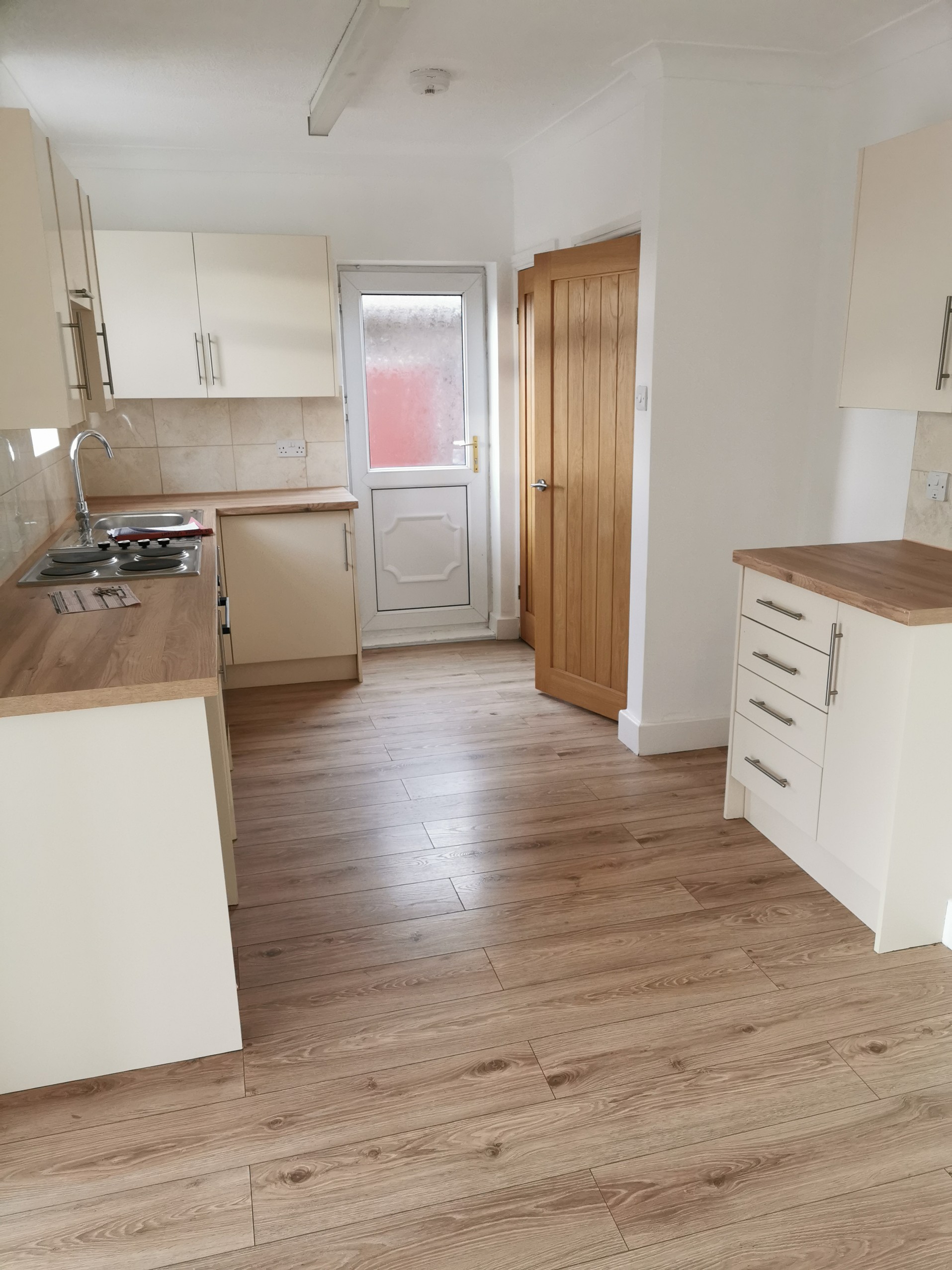 Kitchen with a good range of modern beige gloss slab cupboards and butchers slab worktop with complementary wooden floor. Integrated stainless cooker and gas stainless hob. Stainless sink with chrome swan neck tap and beige marble-effect tiling to all splashback areas. There is an under-stairs pantry area which gives additional storage. Kitchen door leads out onto additional brick built large out-houses ideal for storing garden furniture etc.