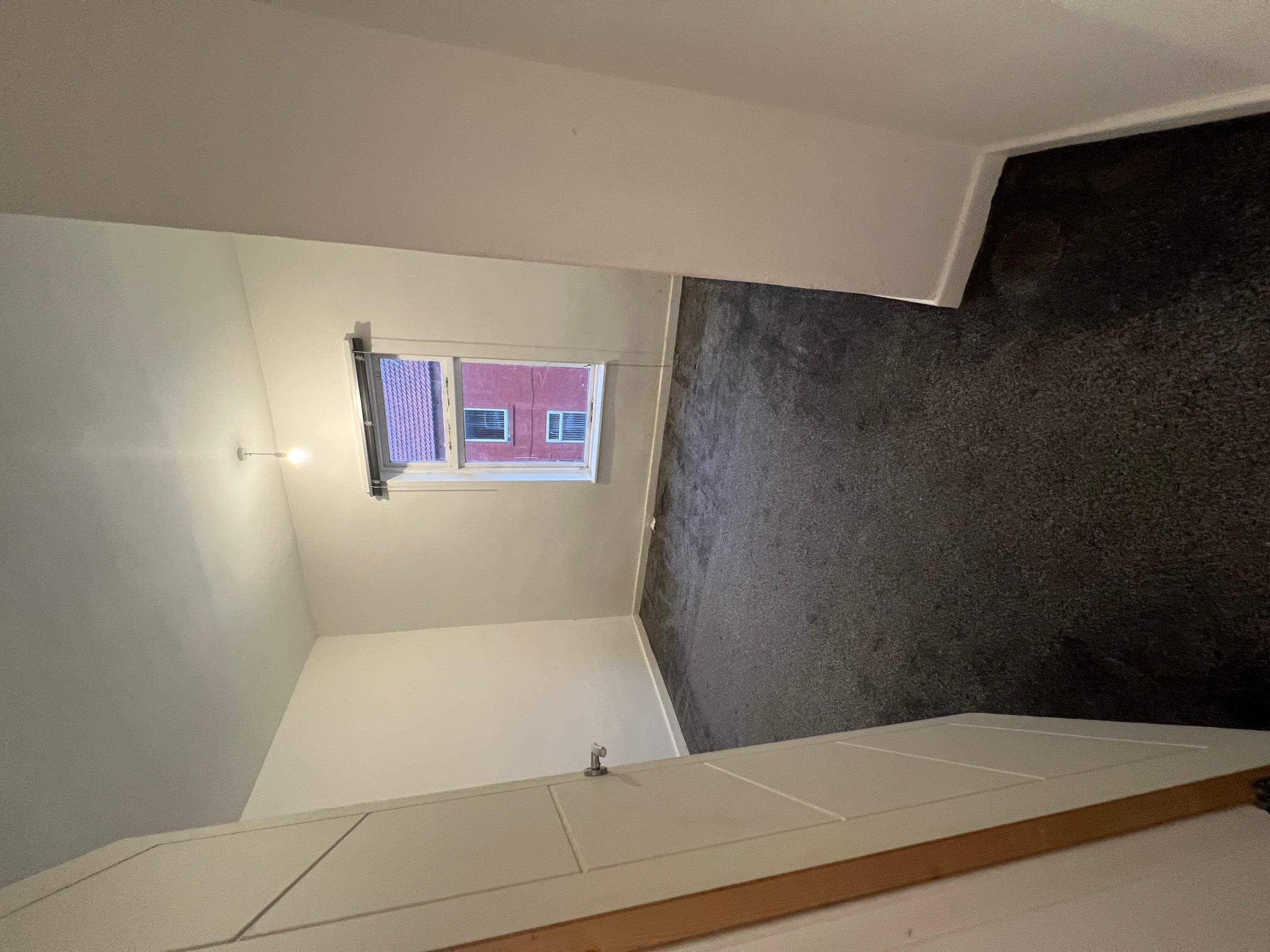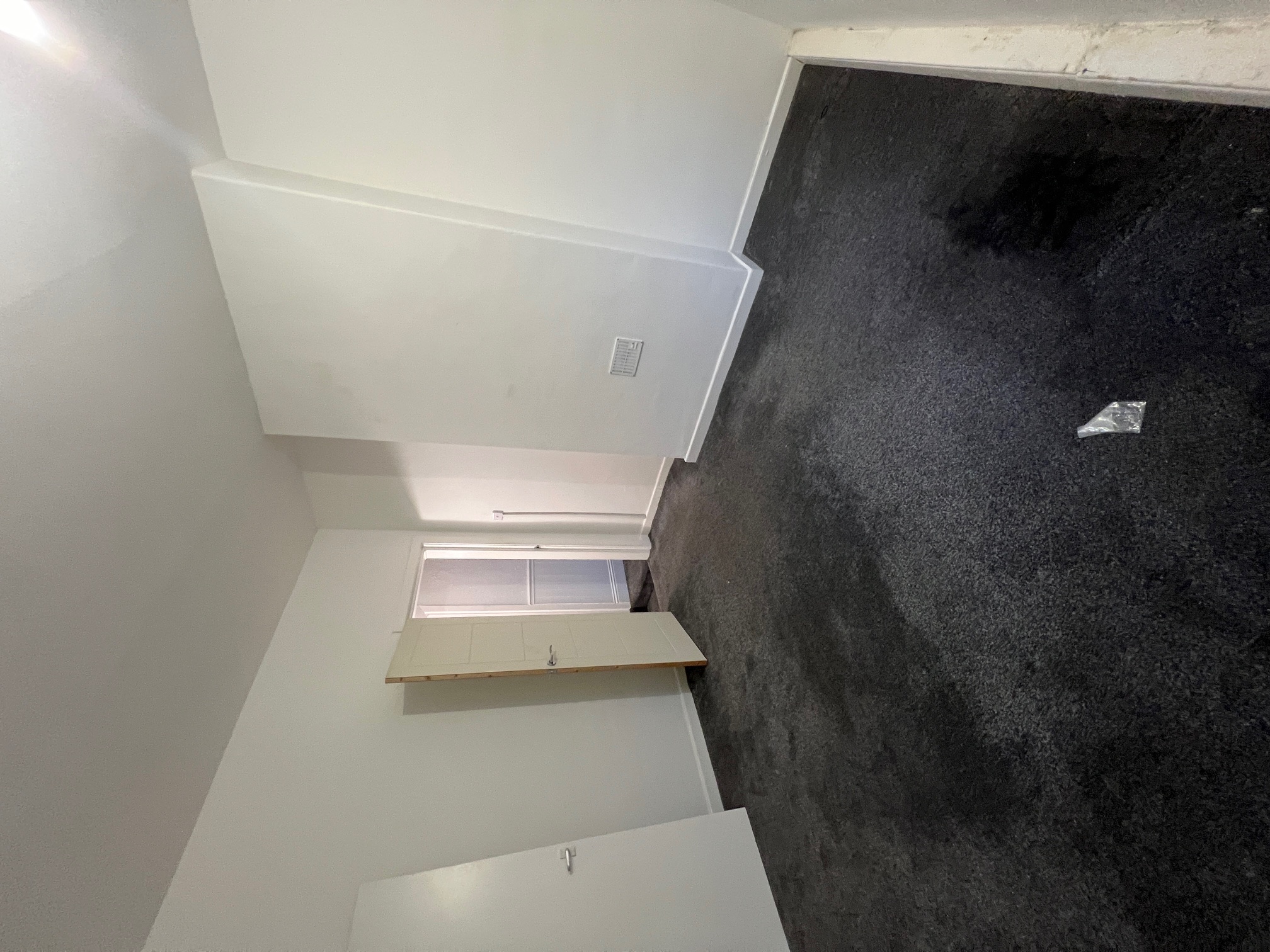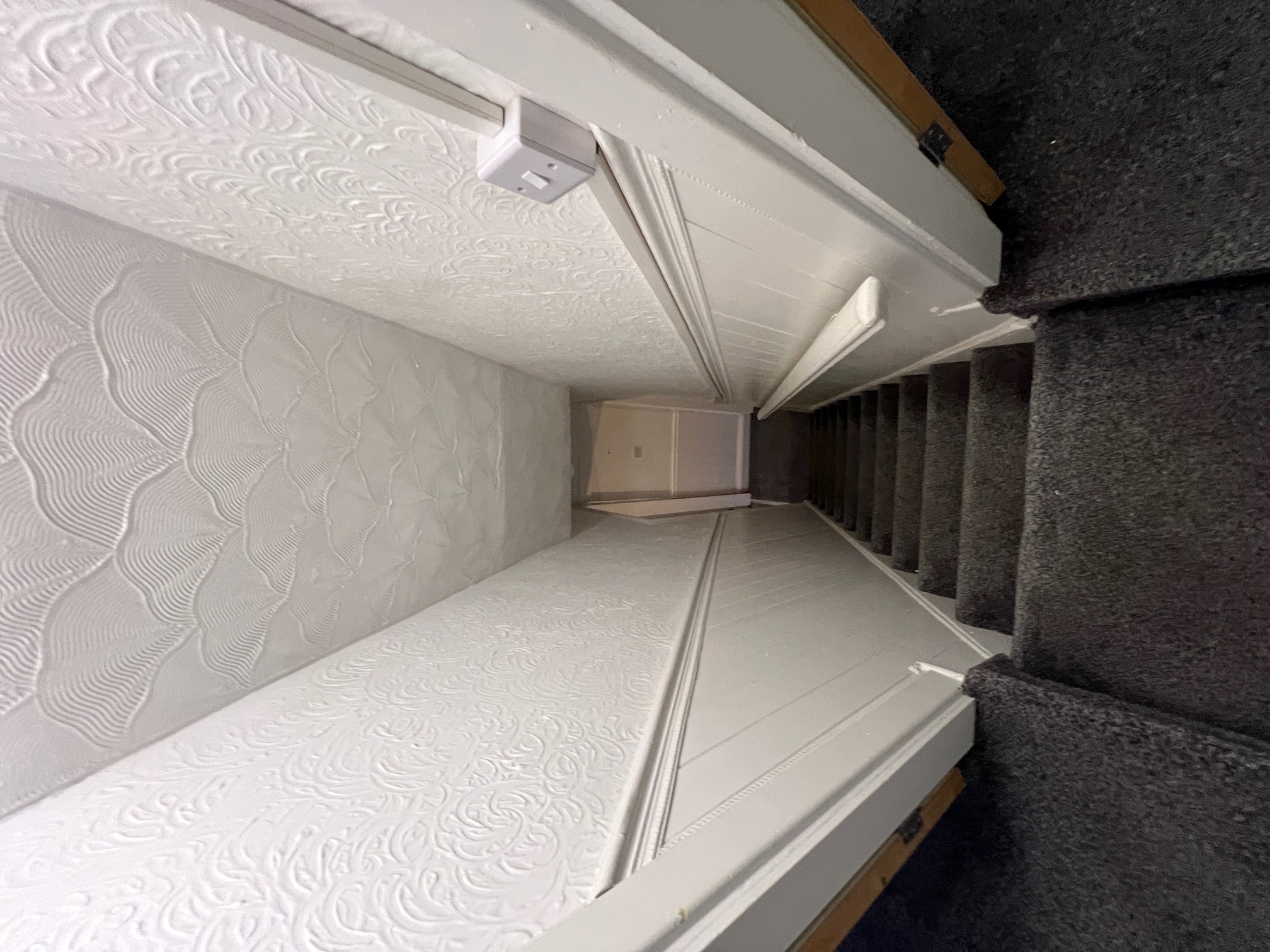 Going up the carpeted staircase leads to 2 x double bedrooms, both with charcoal carpet to floor and neutral plastered walls.