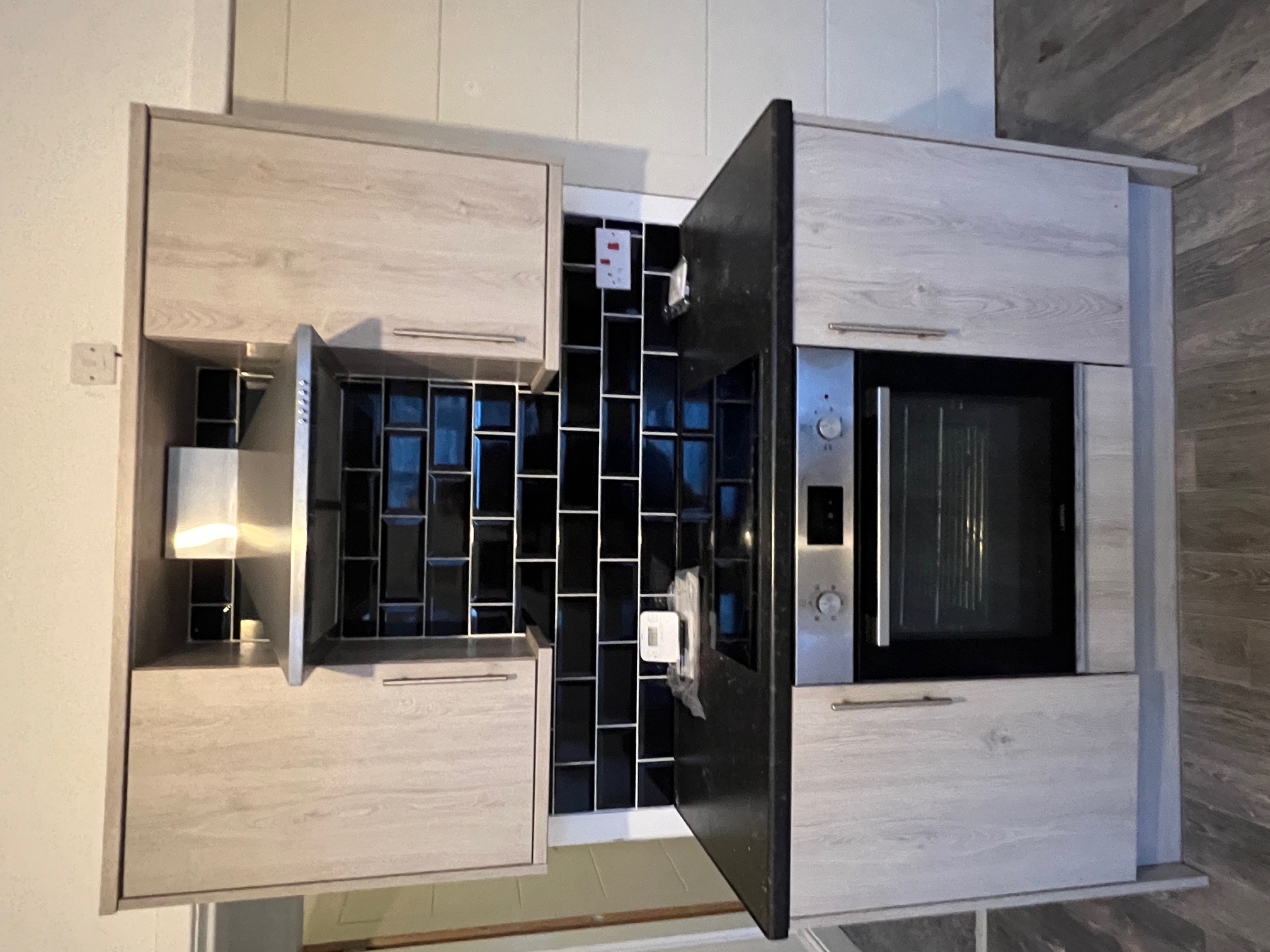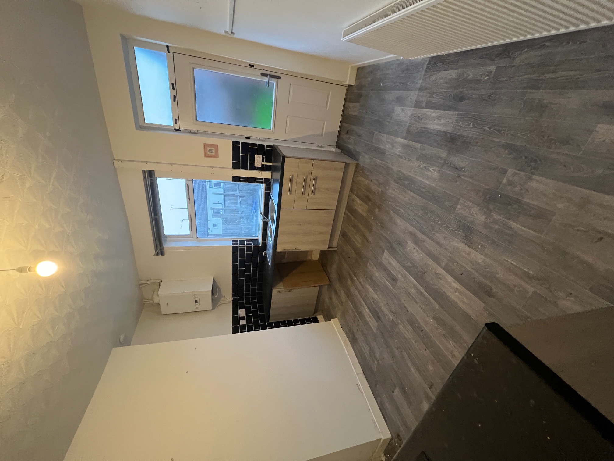 Large kitchen/diner with practical lino to floor and a good range of light wood slab kitchen cabinets and black complementary worktop. Integrated stainless cooker, touch hob and stainless chimney. Black tile-effect splashback tiling to all worktop areas.