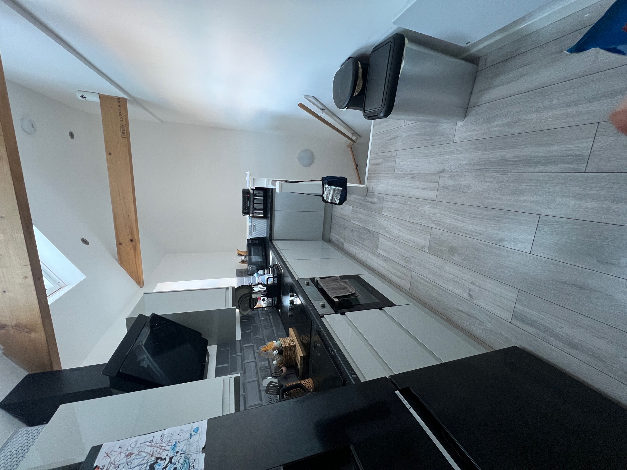 The entrance stairs leads up to a modern loft-style light and airy kitchen with a good range of ultra-modern high gloss slab kitchen units with complementary black worktop and integrated chrome and black oven, hob and extractor. Practical brick-style gloss black tiles to all splashback areas and practical grey wood-effect laminate to the floors. White plastered walls and integrated spotlights and feature beams complement the modern kitchen.
