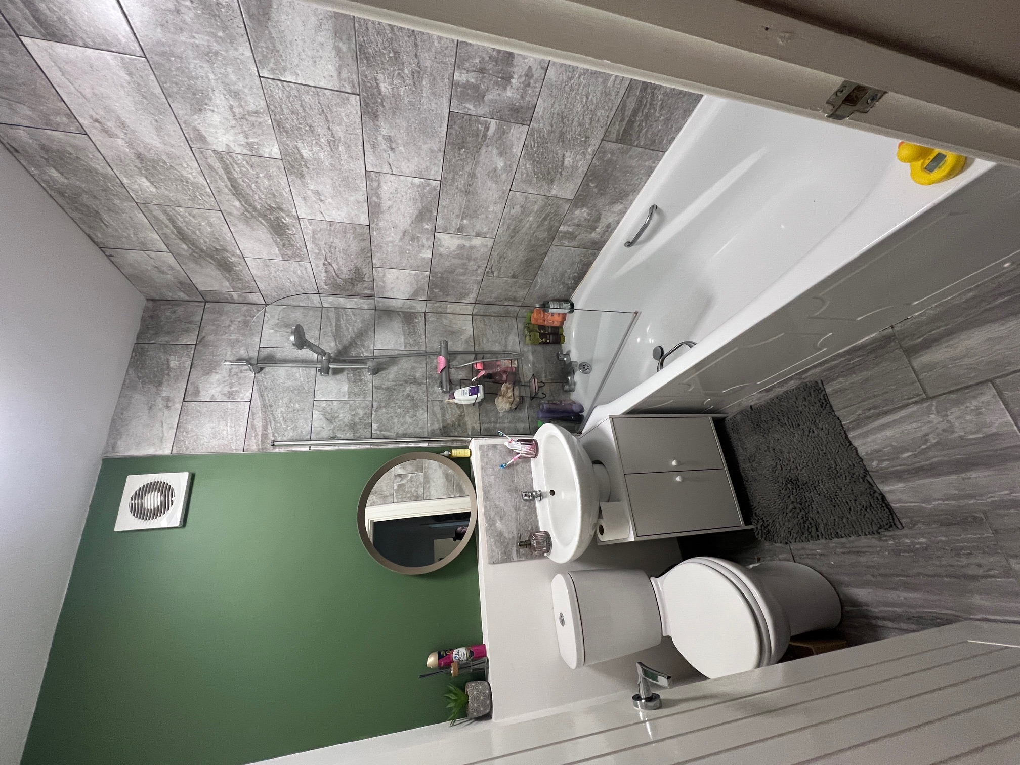 There is a good sized modern bathroom with grey washed marble effect tiles to bath and shower area and to the floor. White modern bathroom suite with under-sink cabinet storage. Above the bath is a chrome power shower with chrome and glass shower screen.