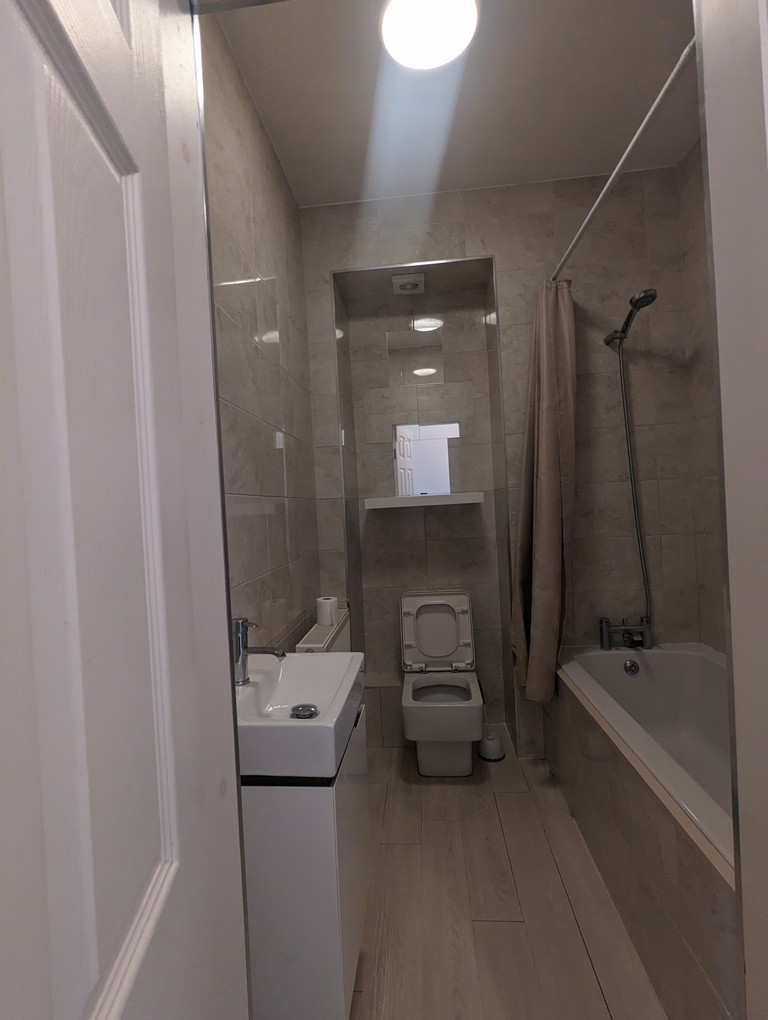 Ultra-modern, fully tiled bathroom with new, white 3 piece square bathroom suite and practical laminate to floor in a modern cream tile and ash. The bathroom has an over-bath mixer shower