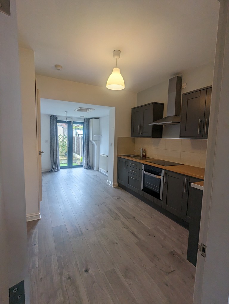 Very large, extended kitchen diner with practical light oak laminate to the floor and a new modern high gloss cream slab kitchen with integrated stainless hob/oven and chimney extractor. Complementary cream splashback tiling to all worktop areas and modern white plastered walls. The kitchen benefits from rear access to the privately fenced garden through UPVC french windows.