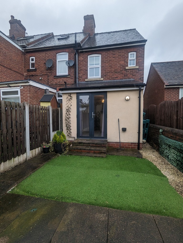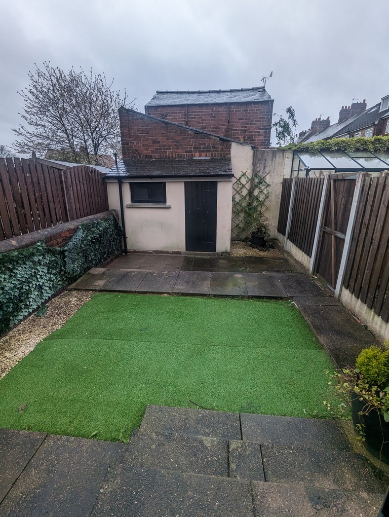 To the rear of the property is a low maintenance patio'd and false grass garden with private fence and brick built outhouse for extra storage.