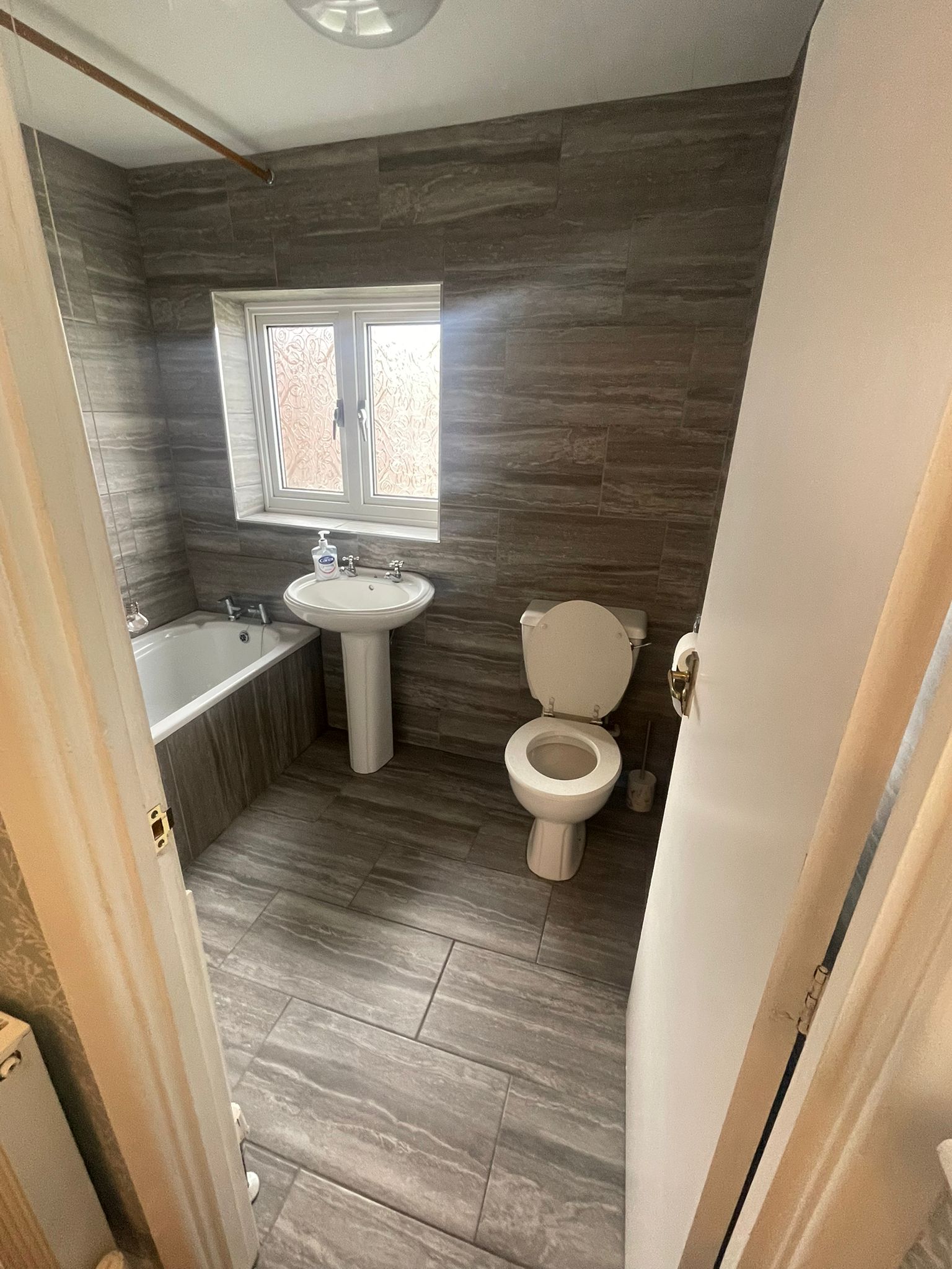 A highly modern bathroom with white 3 piece bathroom suite and over-bath electric shower and rail. Fully tiled to walls and floor with contemporary grey marble tiles - stunning.