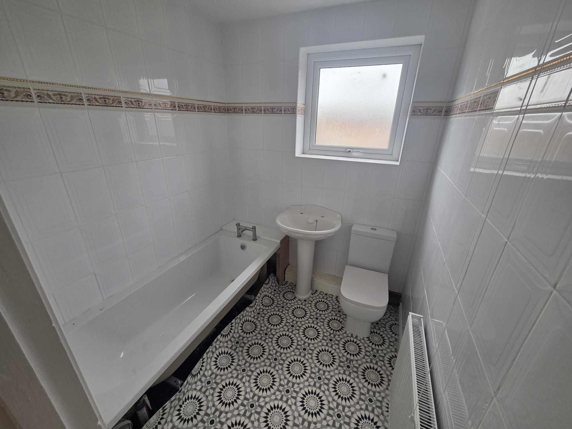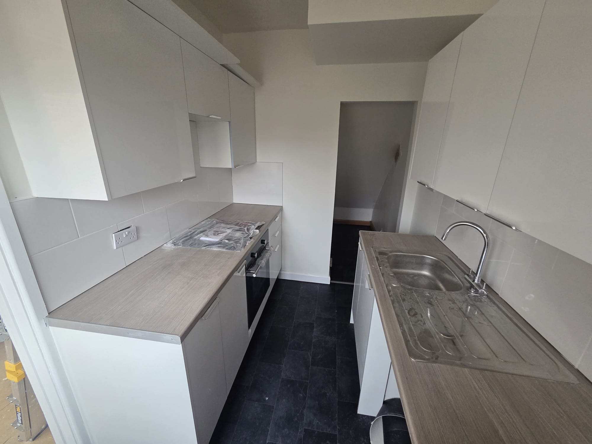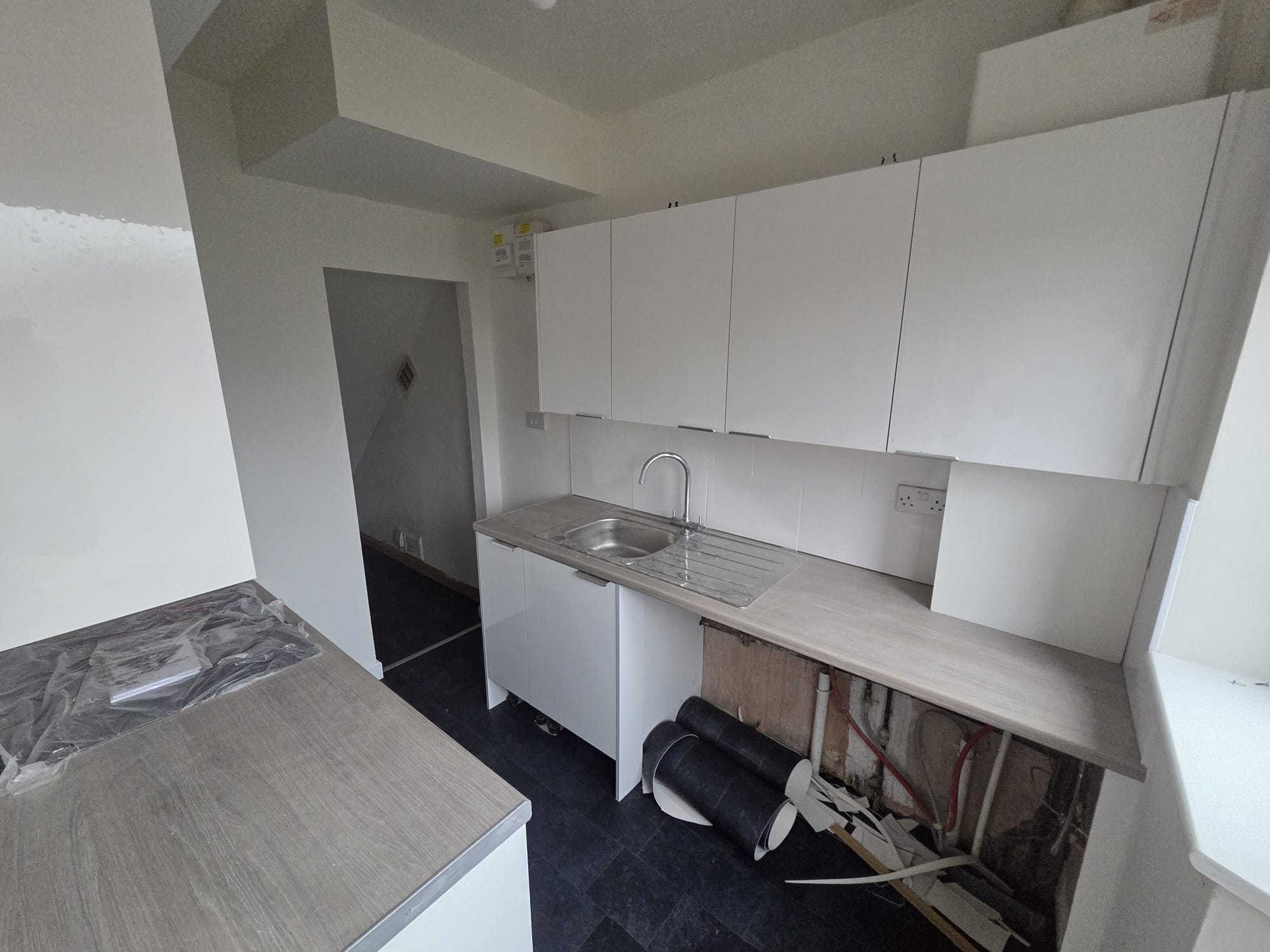 Front and rear access to the property, but going in through the rear brings you into a fully refurbished kitchen, with a good range of new white gloss slab units with modern brushed chrome semi-hidden pull handles. Light oak worktop with inset stainless sink and swan neck tap. White tiling to all worktop areas and white plastered walls. New integrated cooker, hob and extractor with under-worktop washer space and dryer/fridge space. Large under-stairs storage cupboard giving masses of extra space. New lino to be fitted to the floor.