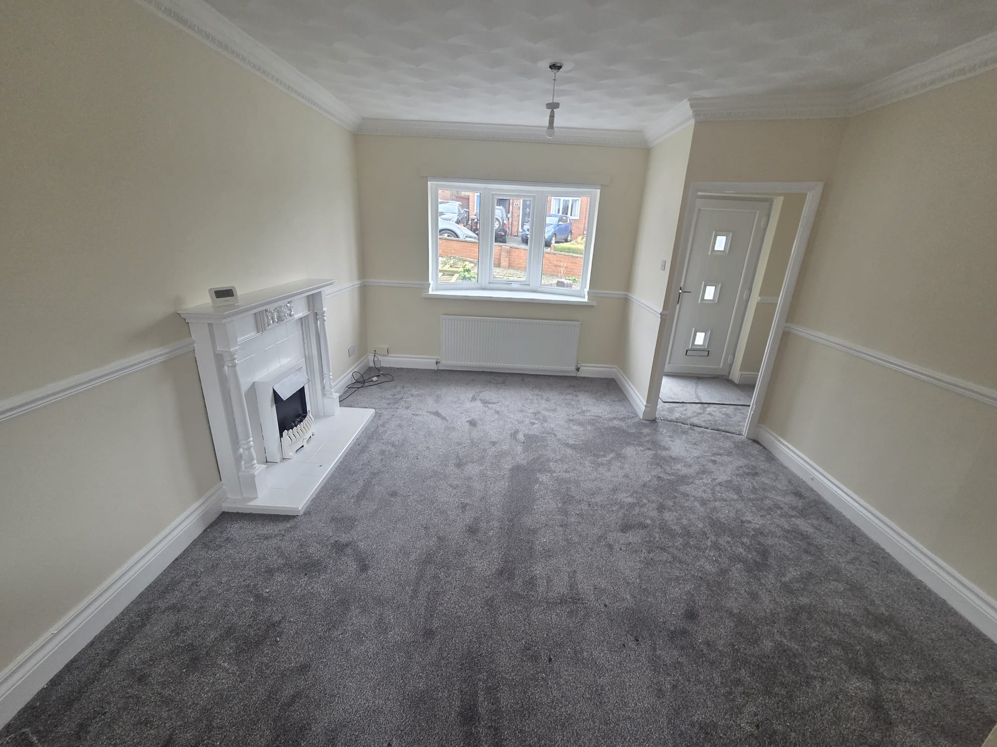 Massive through lounge with neutral cream plastered walls, white gloss and will be having half charcoal and half practical lvt in the dining area. Fireplace.