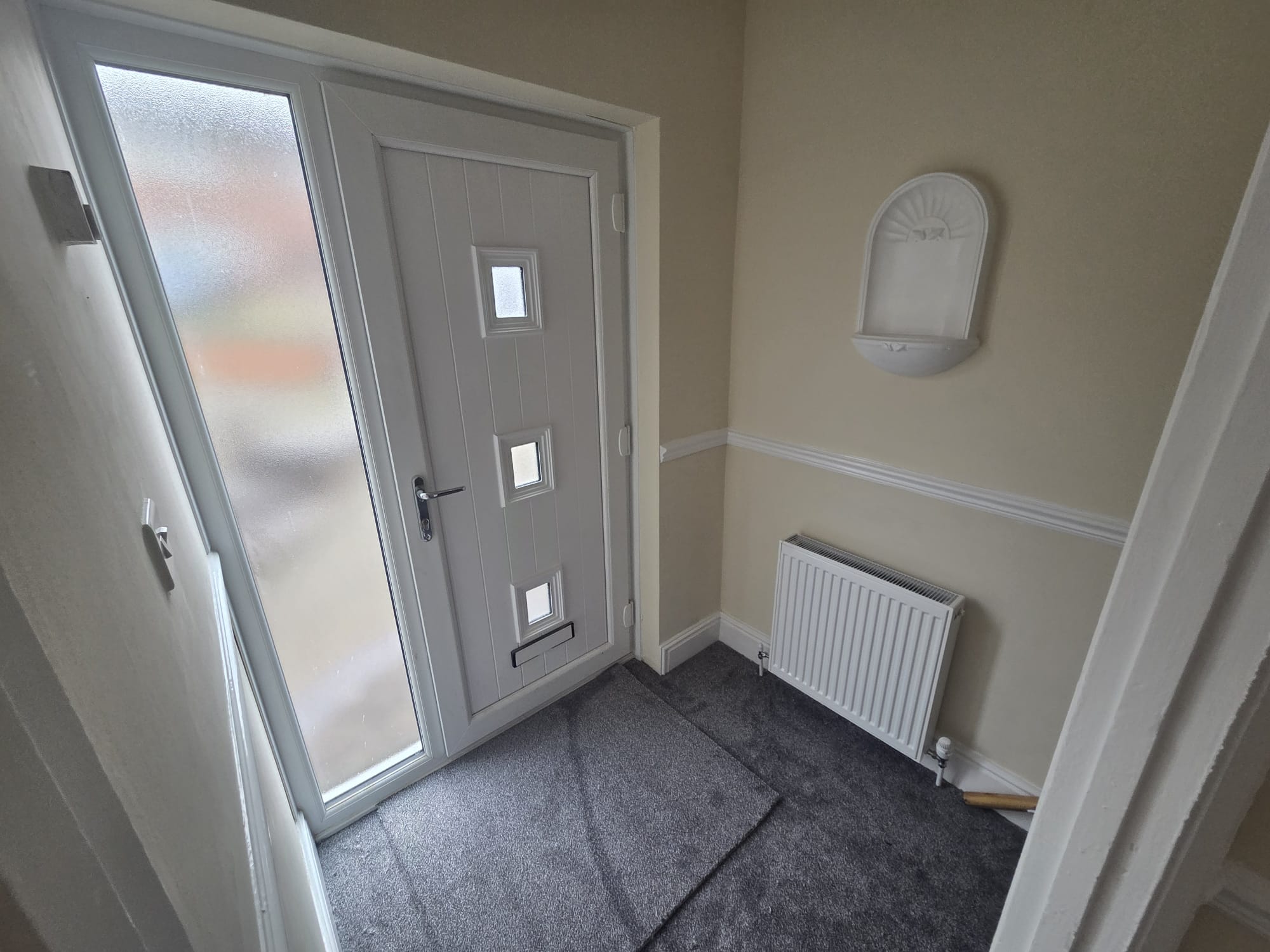 Front door entrance with access up a carpeted staircase leading into a good sized bathroom with new bath/panel, modern toilet and sink and fully tiled walls. New lino to be fitted.