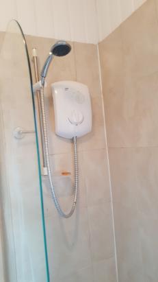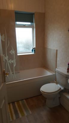Bathroom with modern white bathroom suite and over-the-bath electric shower and glass shower screen. Practical laminate to the floor and splashback tiling/wipe-clean paper to walls. Roller blind to window and stainless towel rails.