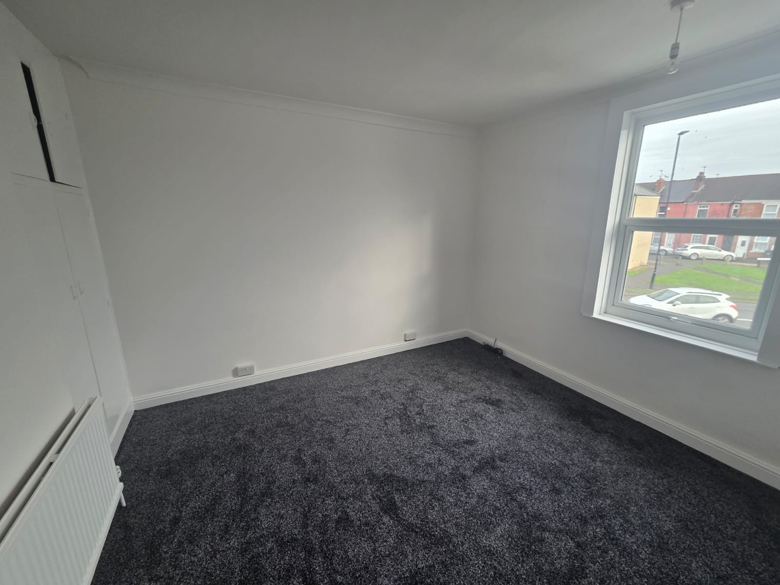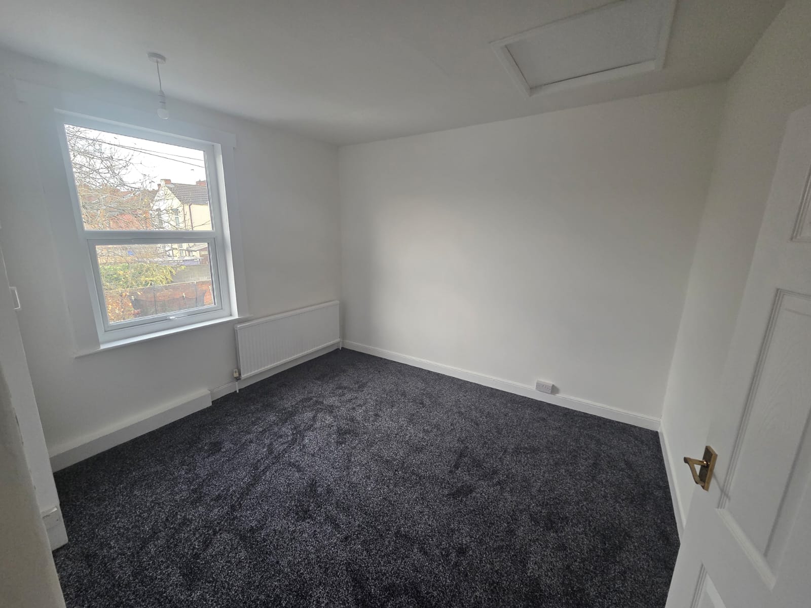 Up the newly carpeted charcoal stairs leads to two double-bed sized bedrooms, both with new charcoal carpet to floor and white plastered walls. One bedroom has integrated wardrobe space.