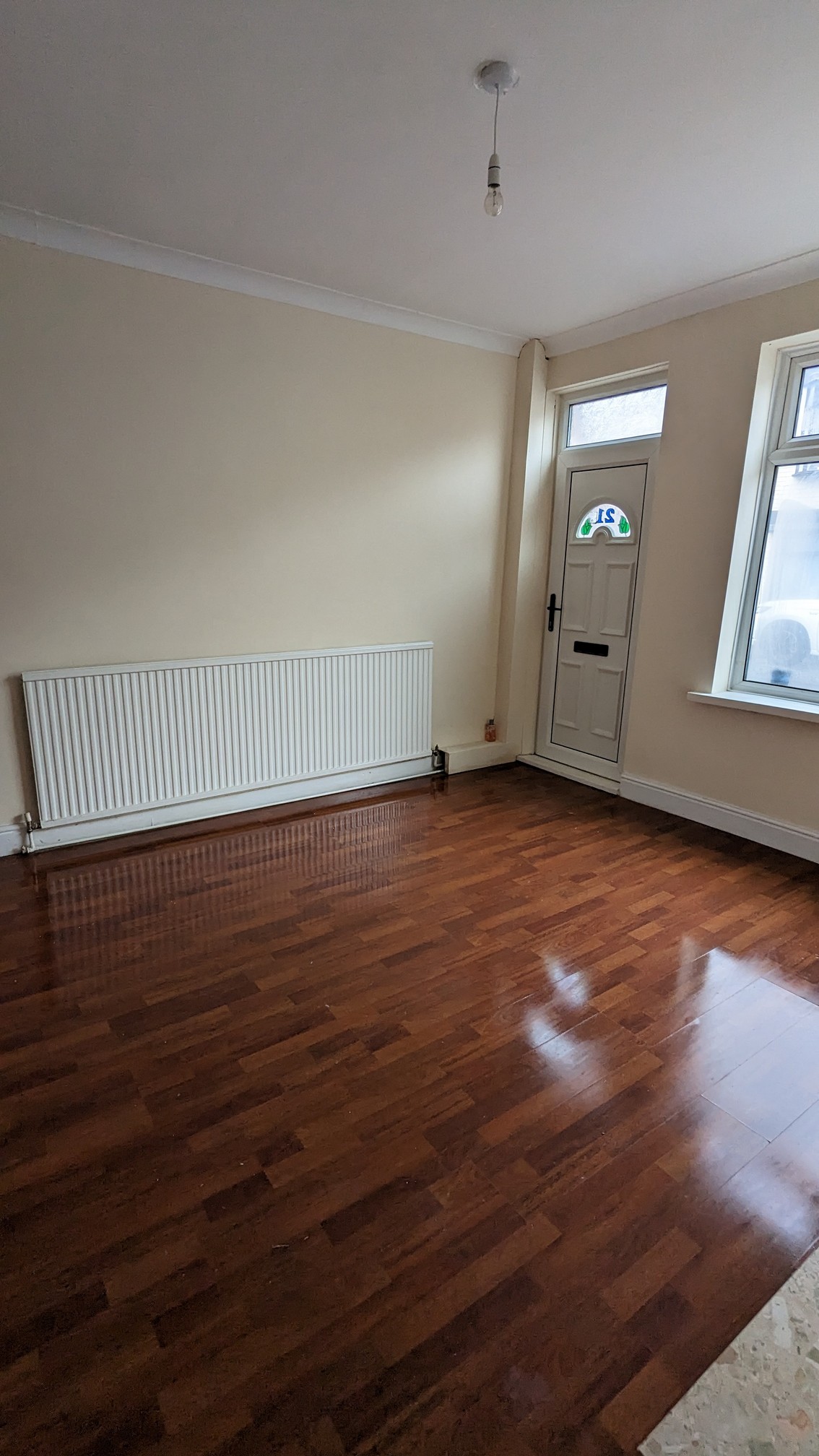 Front room with laminate to floor and cream walls with gloss woodwork.