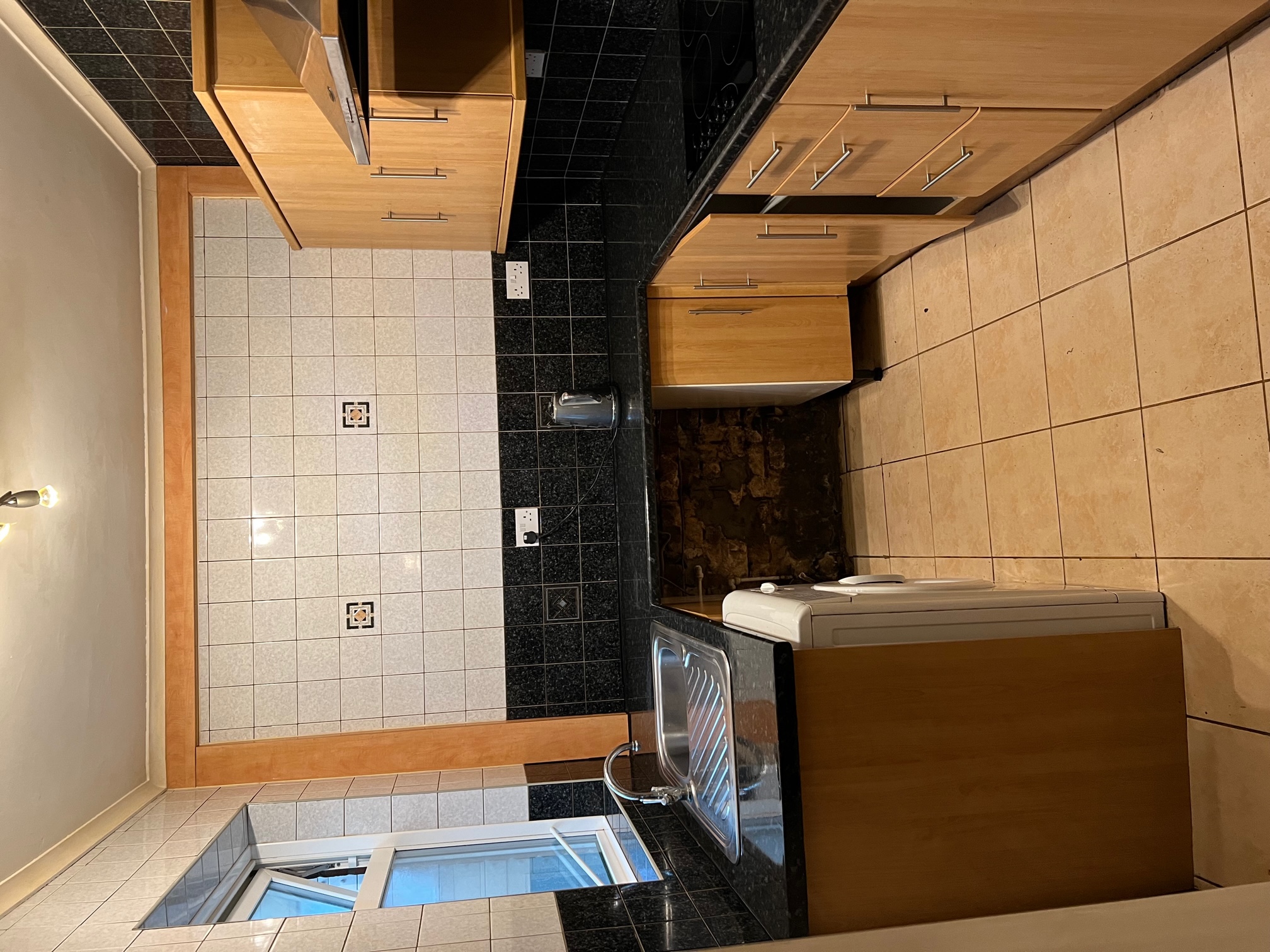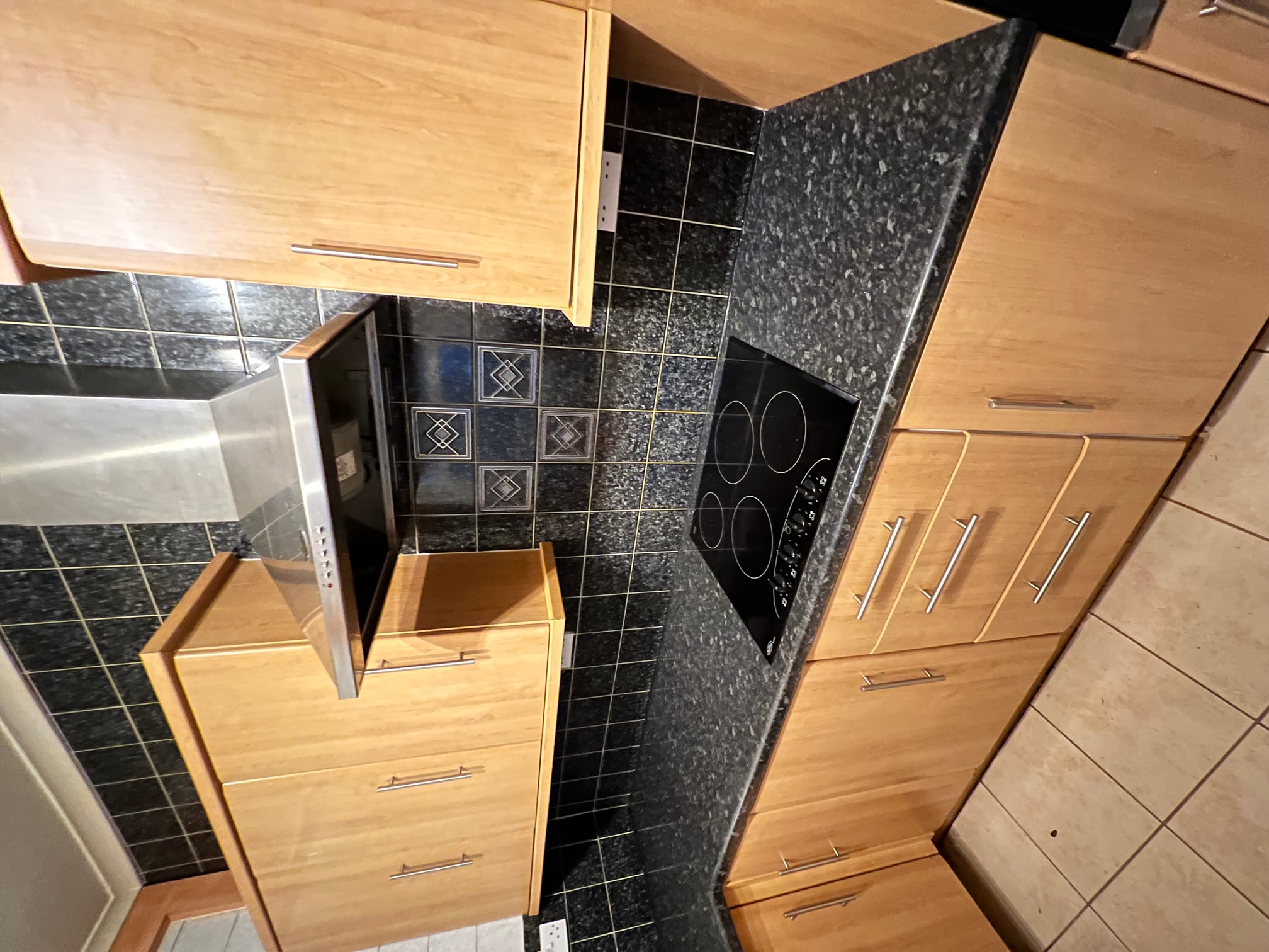 Extended, fully tiled kitchen with a good range of light beech kitchen cabinets with integrated cooker/hob and stainless chimney extractor. Washing machine and space for under-counter fridge.