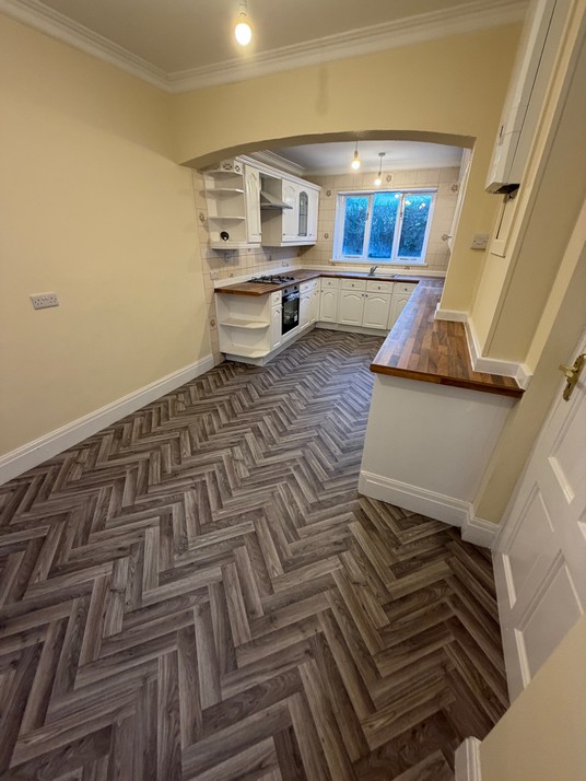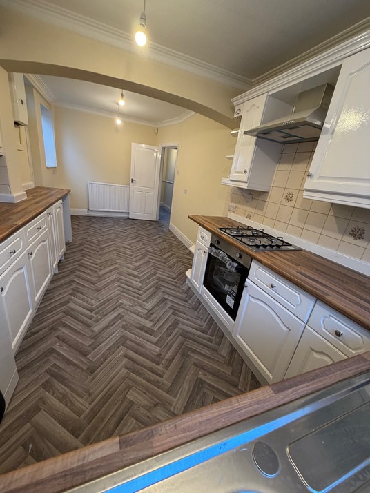 There is a massive kitchen with plenty of room to have a large family dining table. White painted, farmhouse style kitchen cabinets with new oven, hob and chimney extractor. Standalone dishwasher is gifted. Butchers block worktop and inset stainless sink, with tiling to all worktop surfaces. Practical lino to floor and newly decorated cream walls with white woodwork.