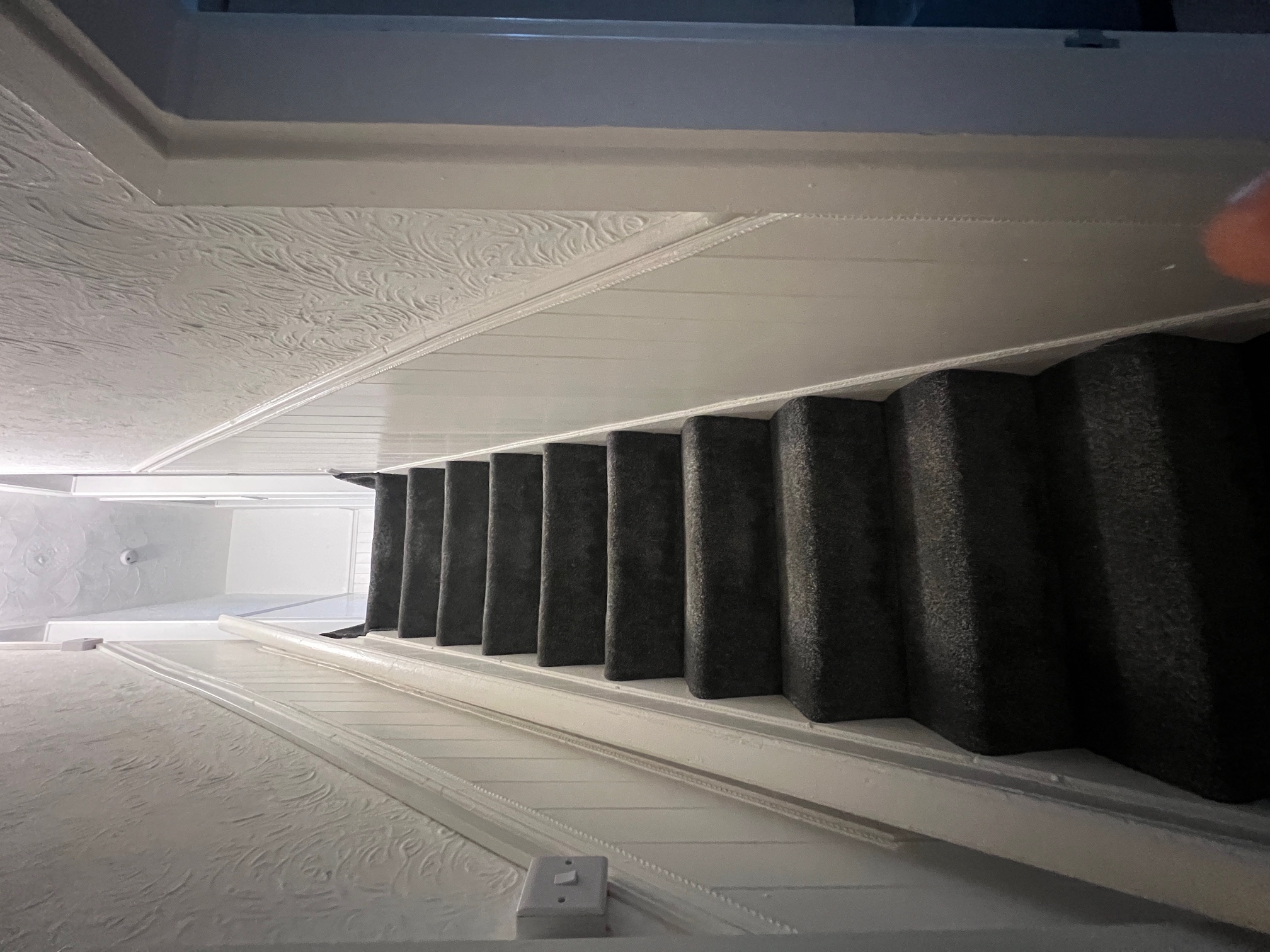 Going up the carpeted staircase leads to 2 x double bedrooms, both with charcoal carpet to floor and neutral plastered walls.