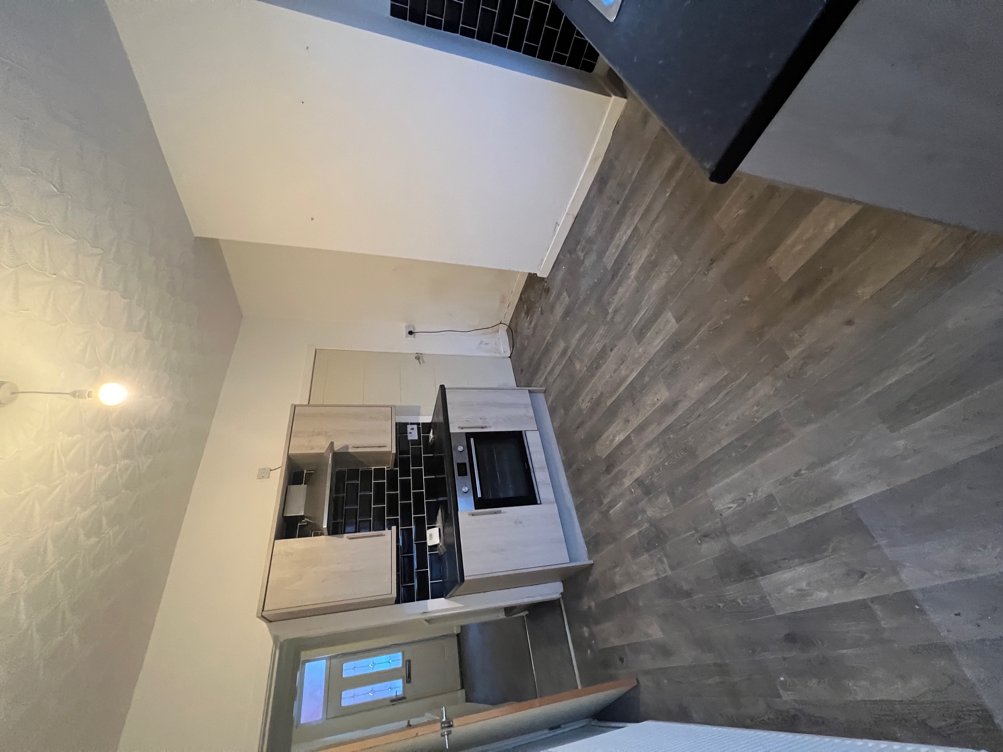 Large kitchen/diner with practical lino to floor and a good range of light wood slab kitchen cabinets and black complementary worktop. Integrated stainless cooker, touch hob and stainless chimney. Black tile-effect splashback tiling to all worktop areas.