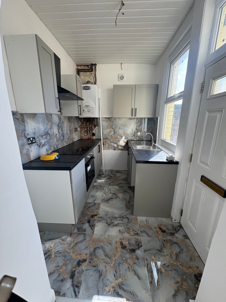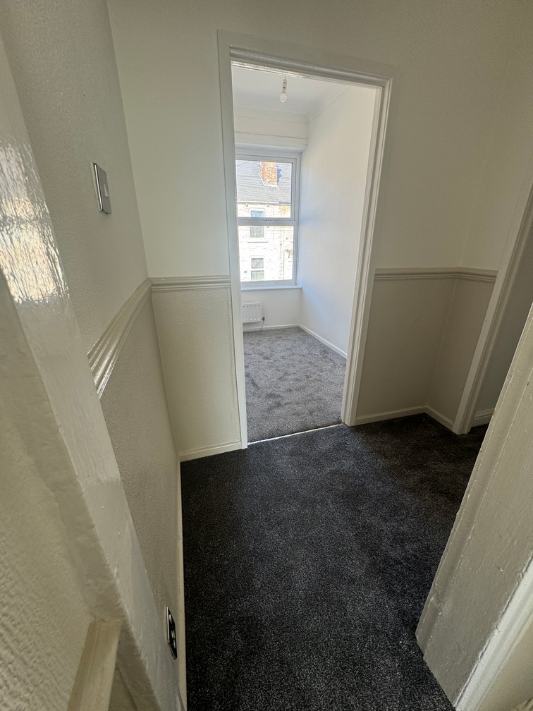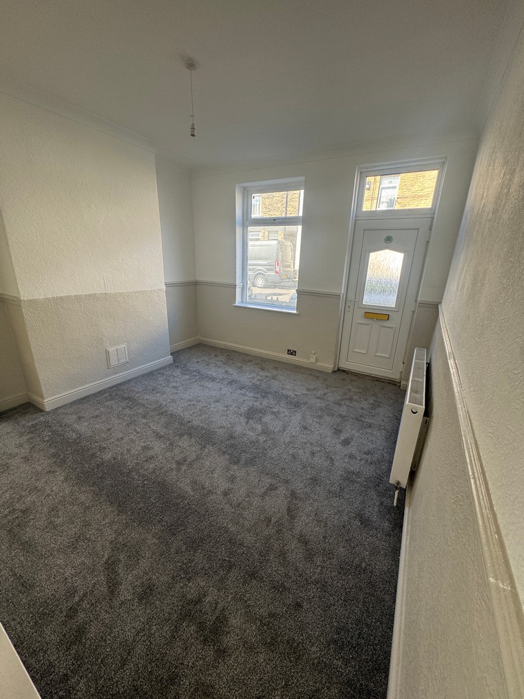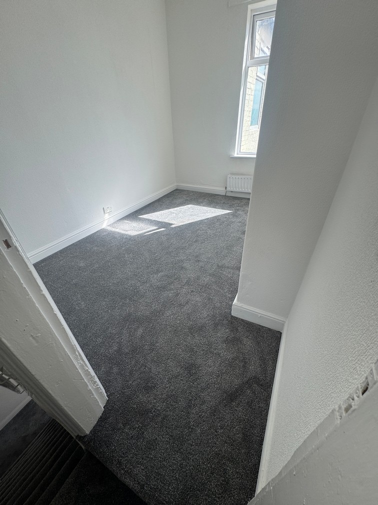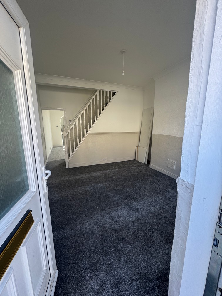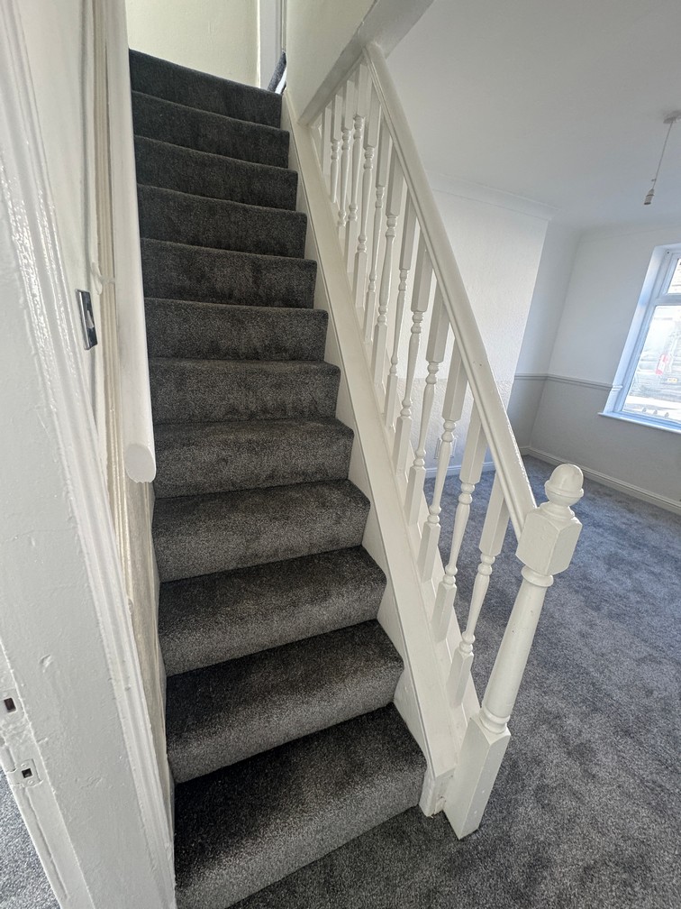 Refurbished 3 bed mid-terraced house on Oxford Street, having UPVC windows and doors with gas central Front room with open plan central staircase, cream and beige split newly decorated walls and new charcoal carpet to floor.