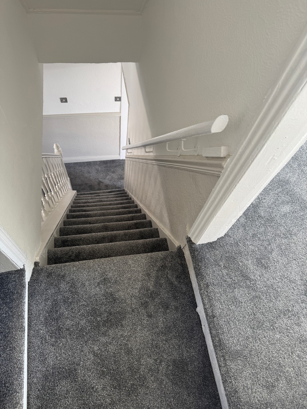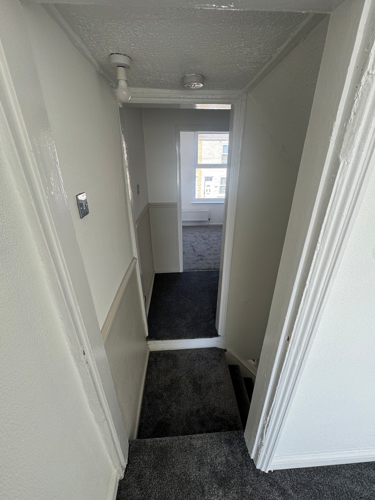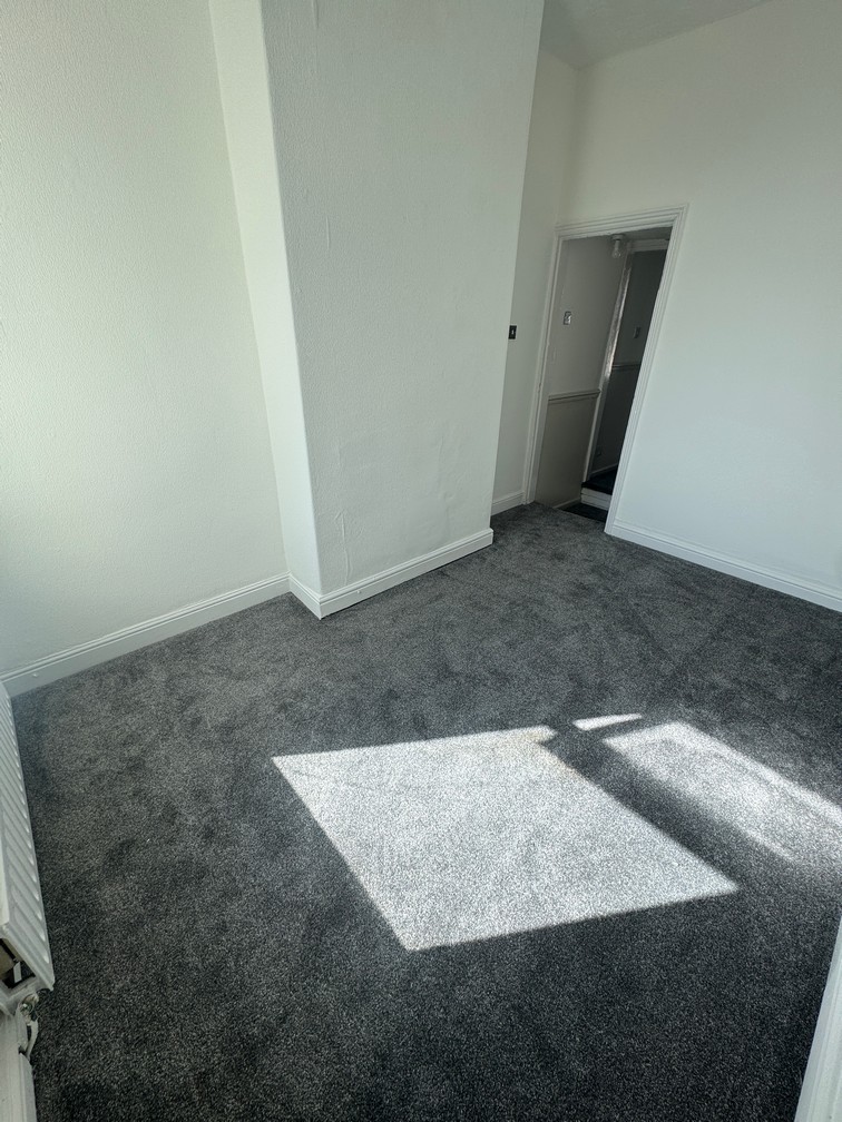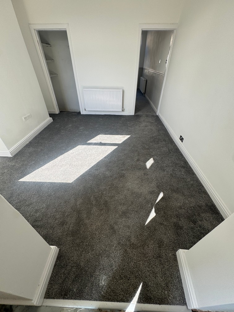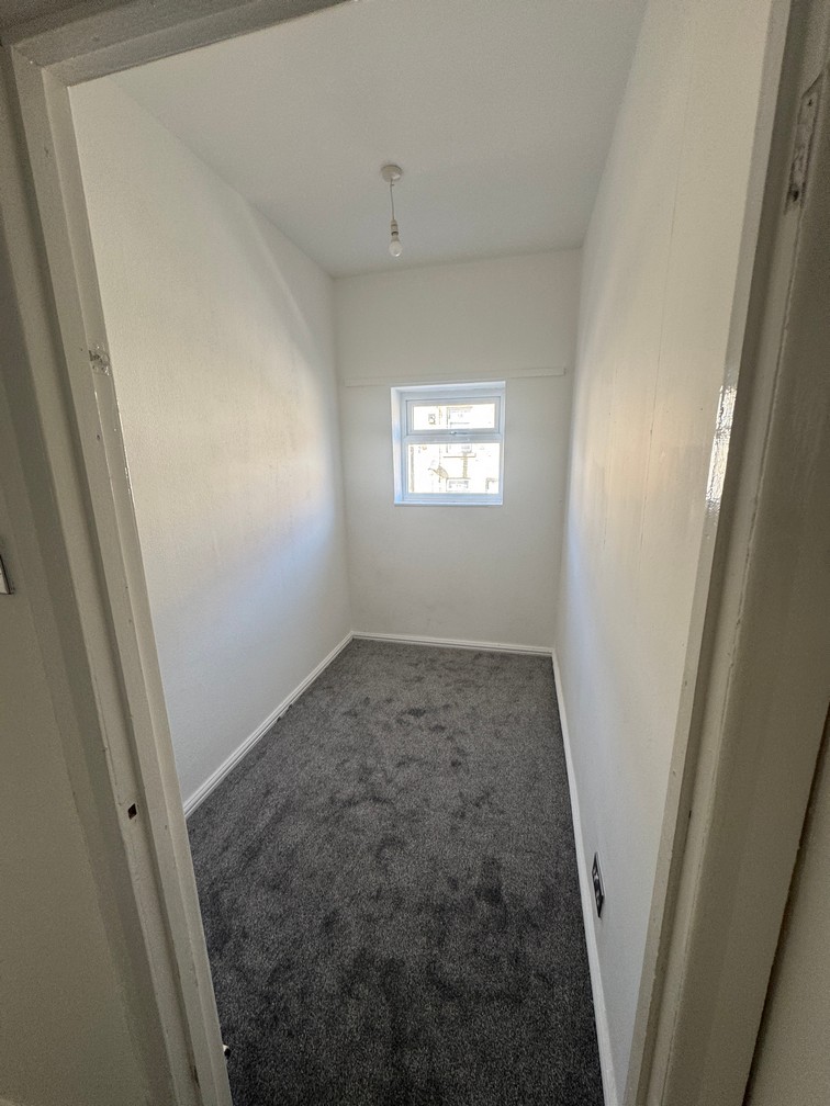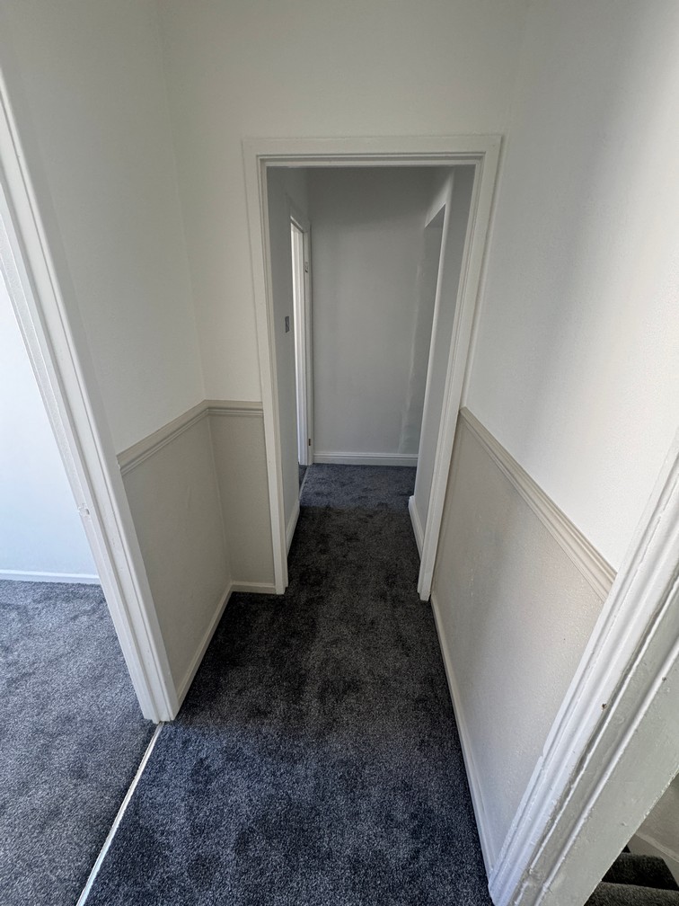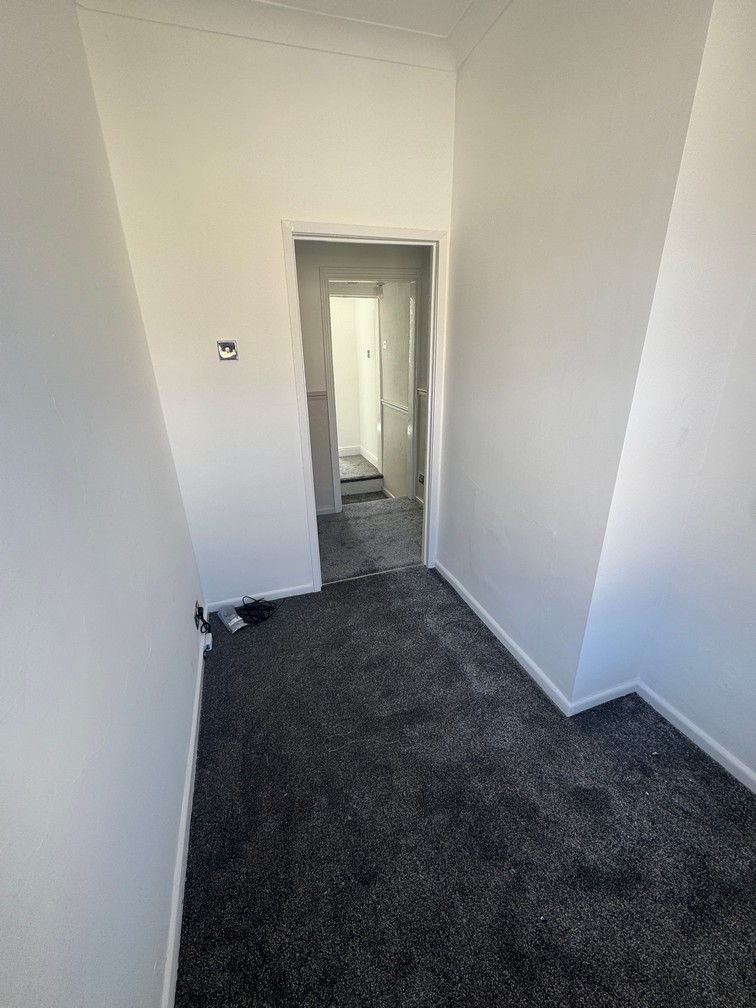 Going up the central newly carpeted staircase leads up to one double and two single bedrooms, each with newly plastered walls and new charcoal carpet to floor.