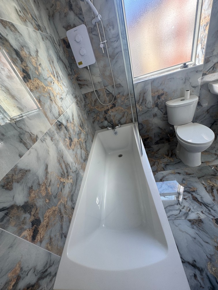 Bathroom with half tiled walls and fully tiled floor in grey marble pattern, new white 3 piece bathroom suite with new over-bath electric shower and glass shower screen. Chrome towel radiator and practical planked modern ceiling.