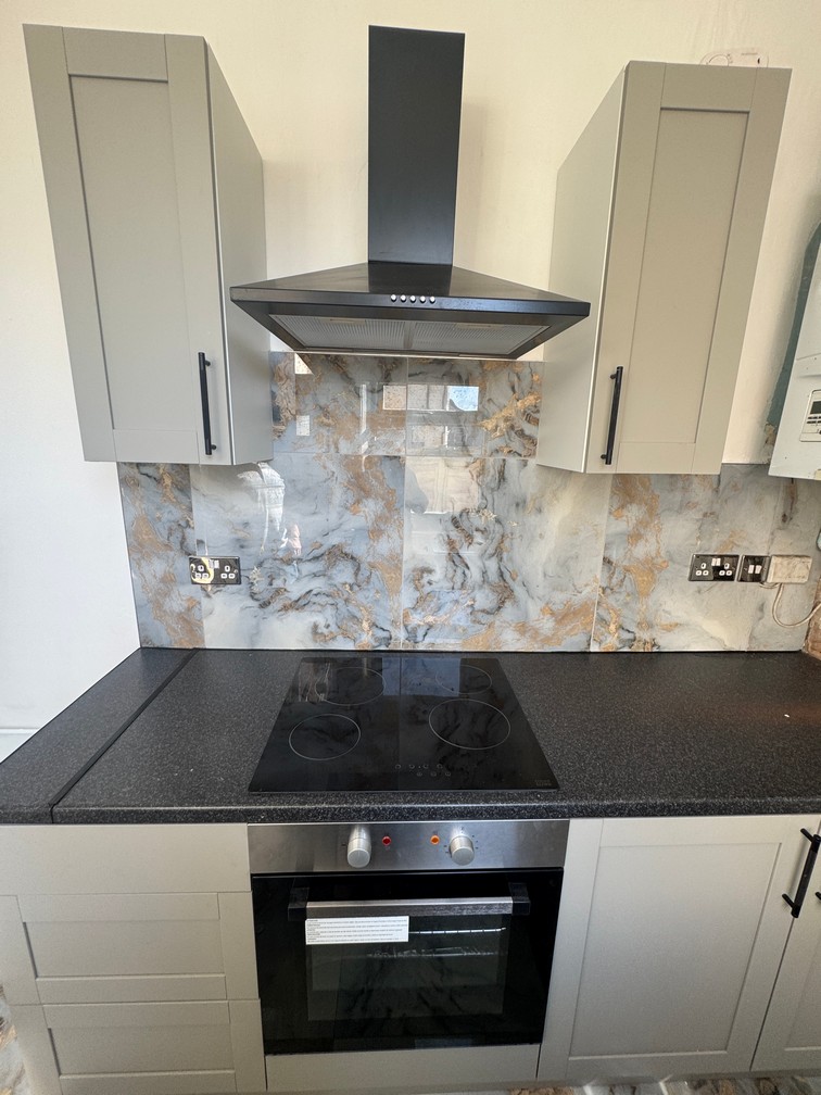 Range of newly fitted grey matt farmhouse style kitchen cabinets with charcoal speckled complementary worktop. Tiled splashback areas and kitchen floor in marbled grey. Inset stainless sink and integrated stainless cooker, black touch control hob and black chimney. Practical planked modern ceiling.